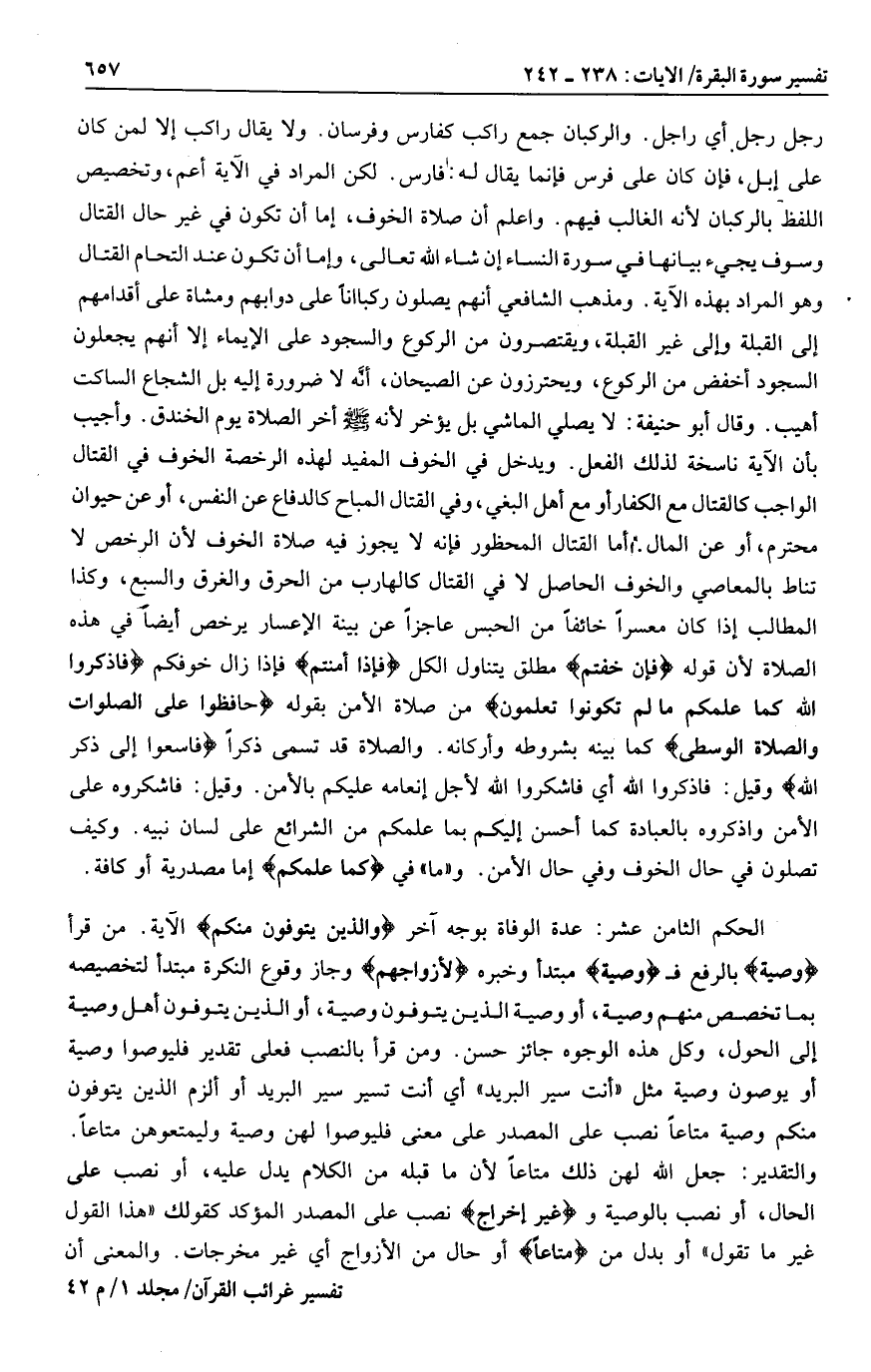 الحكم الثامن عشر: عدة الوفاة بوجه آخر وَالَّذِينَ يُتَوَفَّوْنَ مِنْكُمْ الآية. من قرأ وَصِيَّةً بالرفع ف وَصِيَّةً مبتدأ وخبره لِأَزْواجِهِمْ وجاز وقوع النكرة مبتدأ لتخصيصه بما تخصص منهم وصية، أو وصية الذين يتوفون وصية، أو الذين يتوفون أهل وصية إلى الحول، وكل هذه الوجوه جائز حسن. ومن قرأ بالنصب فعلى تقدير فليوصوا وصية أو يوصون وصية مثل «أنت سير البريد» أي أنت تسير سير البريد أو ألزم الذين يتوفون منكم وصية متاعا نصب على المصدر على معنى فليوصوا لهن وصية وليمتعوهن متاعا.