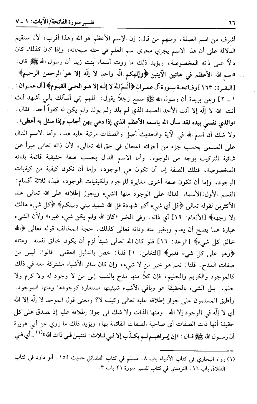 ولا شك أن اسم الله في الآية والحديث أصل والصفات مرتبة عليه هذا، وأما الاسم الدال على المسمى بحسب جزء من أجزائه فمحال في حق الله تعالى، لأن ذاته تعالى مبرأ عن شائبة التركيب بوجه من الوجوه. وأما الاسم الدال بحسب صفة حقيقية قائمة بذاته المخصوصة، فتلك الصفة إما أن تكون هي الوجود، وإما أن تكون كيفية من كيفيات الوجود، وإما أن تكون صفة أخرى مغايرة للوجود ولكيفيات الوجود، فهذه ثلاثة أقسام:
