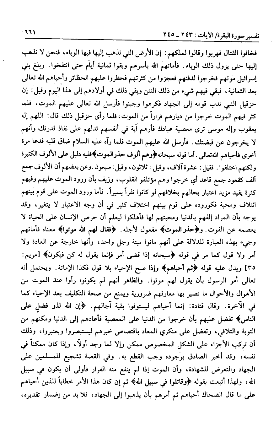 فخافوا القتال فهربوا وقالوا لملكهم: إن الأرض التي نذهب إليها فيها الوباء، فنحن لا نذهب إليها حتى يزول ذلك الوباء. فأماتهم الله بأسرهم وبقوا ثمانية أيام حتى انتفخوا. وبلغ بني إسرائيل موتهم فخرجوا لدفنهم فعجزوا من كثرتهم فحظروا عليهم الحظائر وأحياهم الله تعالى بعد الثمانية، فبقي فيهم شيء من ذلك النتن وبقي ذلك في أولادهم إلى هذا اليوم وقيل: إن حزقيل النبي ندب قومه إلى الجهاد فكرهوا وجبنوا فأرسل الله تعالى عليهم الموت، فلما كثر فيهم الموت خرجوا من ديارهم فرارا من الموت، فلما رأى حزقيل ذلك قال: اللهم إله يعقوب وإله موسى ترى معصية عبادك فأرهم آية في أنفسهم تدلهم على نفاذ قدرتك وأنهم لا يخرجون عن قبضتك. فأرسل الله عليهم الموت فلما رآه عليه السلام ضاق قلبه فدعا مرة أخرى فأحياهم الله تعالى. أما قوله سبحانه وَهُمْ أُلُوفٌ حَذَرَ الْمَوْتِ ففيه دليل على الألوف الكثيرة ولكنهم اختلفوا. فقيل: عشرة آلاف، وقيل: ثلاثون، وقيل: سبعون. وعن بعضهم أن الألوف جمع آلف كقعود جمع قاعد أي خرجوا وهم مؤتلفو القلوب، وزيف بأن ورود الموت عليهم وفيهم كثرة يفيد مزيد اعتبار بحالهم بخلافهم لو كانوا نفرا يسيرا. فأما ورود الموت على قوم بينهم ائتلاف ومحبة فكوروده على قوم بينهم اختلاف كثير في أن وجه الاعتبار لا يتغير، وقد يوجه بأن المراد إلفهم بالدنيا ومحبتهم لها فأهلكوا ليعلم أن حرص الإنسان على الحياة لا يعصمه عن الفوت. وحَذَرَ الْمَوْتِ مفعول لأجله. فَقالَ لَهُمُ اللَّهُ مُوتُوا معناه فأماتهم وجيء بهذه العبارة للدلالة على أنهم ماتوا ميتة رجل واحد، وأنها خارجة عن العادة ولا أمر ولا قول كما مر في قوله سُبْحانَهُ إِذا قَضى أَمْراً فَإِنَّما يَقُولُ لَهُ كُنْ فَيَكُونُ [مريم: