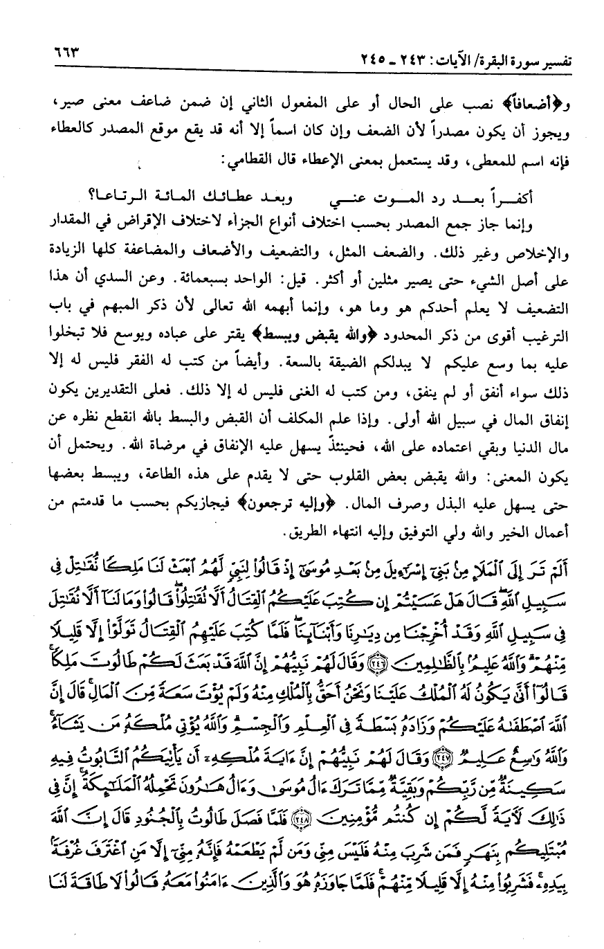 وإنما جاز جمع المصدر بحسب اختلاف أنواع الجزاء لاختلاف الإقراض في المقدار والإخلاص وغير ذلك. والضعف المثل، والتضعيف والأضعاف والمضاعفة كلها الزيادة على أصل الشيء حتى يصير مثلين أو أكثر. قيل: الواحد بسبعمائة. وعن السدي أن هذا التضعيف لا يعلم أحدكم هو وما هو، وإنما أبهمه الله تعالى لأن ذكر المبهم في باب الترغيب أقوى من ذكر المحدود وَاللَّهُ يَقْبِضُ وَيَبْصُطُ يقتر على عباده ويوسع فلا تبخلوا عليه بما وسع عليكم لا يبدلكم الضيقة بالسعة. وأيضا من كتب له الفقر فليس له إلا ذلك سواء أنفق أو لم ينفق، ومن كتب له الغنى فليس له إلا ذلك. فعلى التقديرين يكون إنفاق المال في سبيل الله أولى. وإذا علم المكلف أن القبض والبسط بالله انقطع نظره عن مال الدنيا وبقي اعتماده على الله، فحينئذ يسهل عليه الإنفاق في مرضاة الله. ويحتمل أن يكون المعنى: والله يقبض بعض القلوب حتى لا يقدم على هذه الطاعة، ويبسط بعضها حتى يسهل عليه البذل وصرف المال. وَإِلَيْهِ تُرْجَعُونَ فيجازيكم بحسب ما قدمتم من أعمال الخير والله ولي التوفيق وإليه انتهاء الطريق.