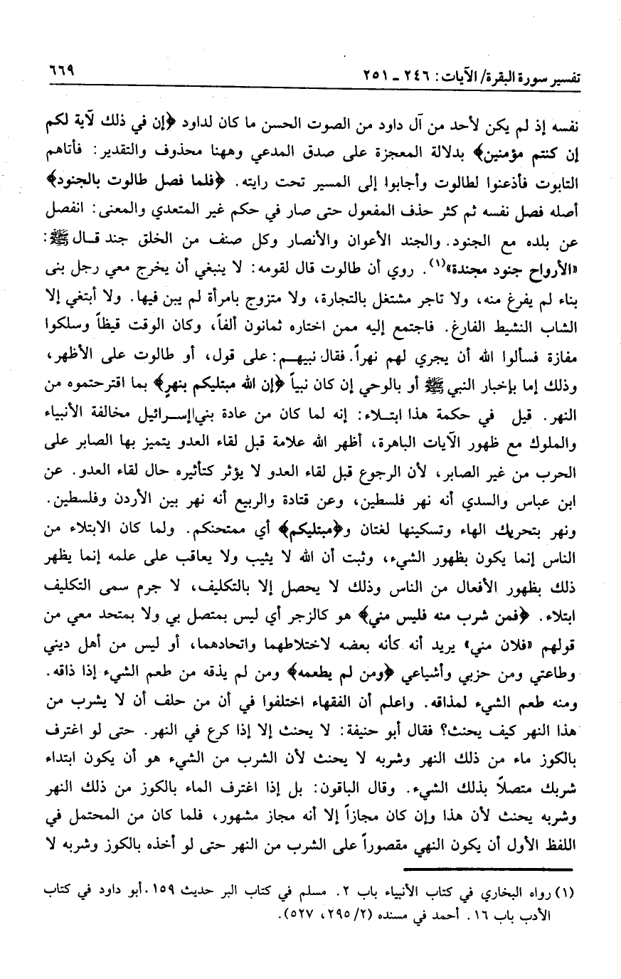 نفسه إذ لم يكن لأحد من آل داود من الصوت الحسن ما كان لداود إِنَّ فِي ذلِكَ لَآيَةً لَكُمْ إِنْ كُنْتُمْ مُؤْمِنِينَ بدلالة المعجزة على صدق المدعي وهاهنا محذوف والتقدير: فأتاهم التابوت فأذعنوا لطالوت وأجابوا إلى المسير تحت رايته. فَلَمَّا فَصَلَ طالُوتُ بِالْجُنُودِ أصله فصل نفسه ثم كثر حذف المفعول حتى صار في حكم غير المتعدي والمعنى: انفصل عن بلده مع الجنود. والجند الأعوان والأنصار وكل صنف من الخلق جند