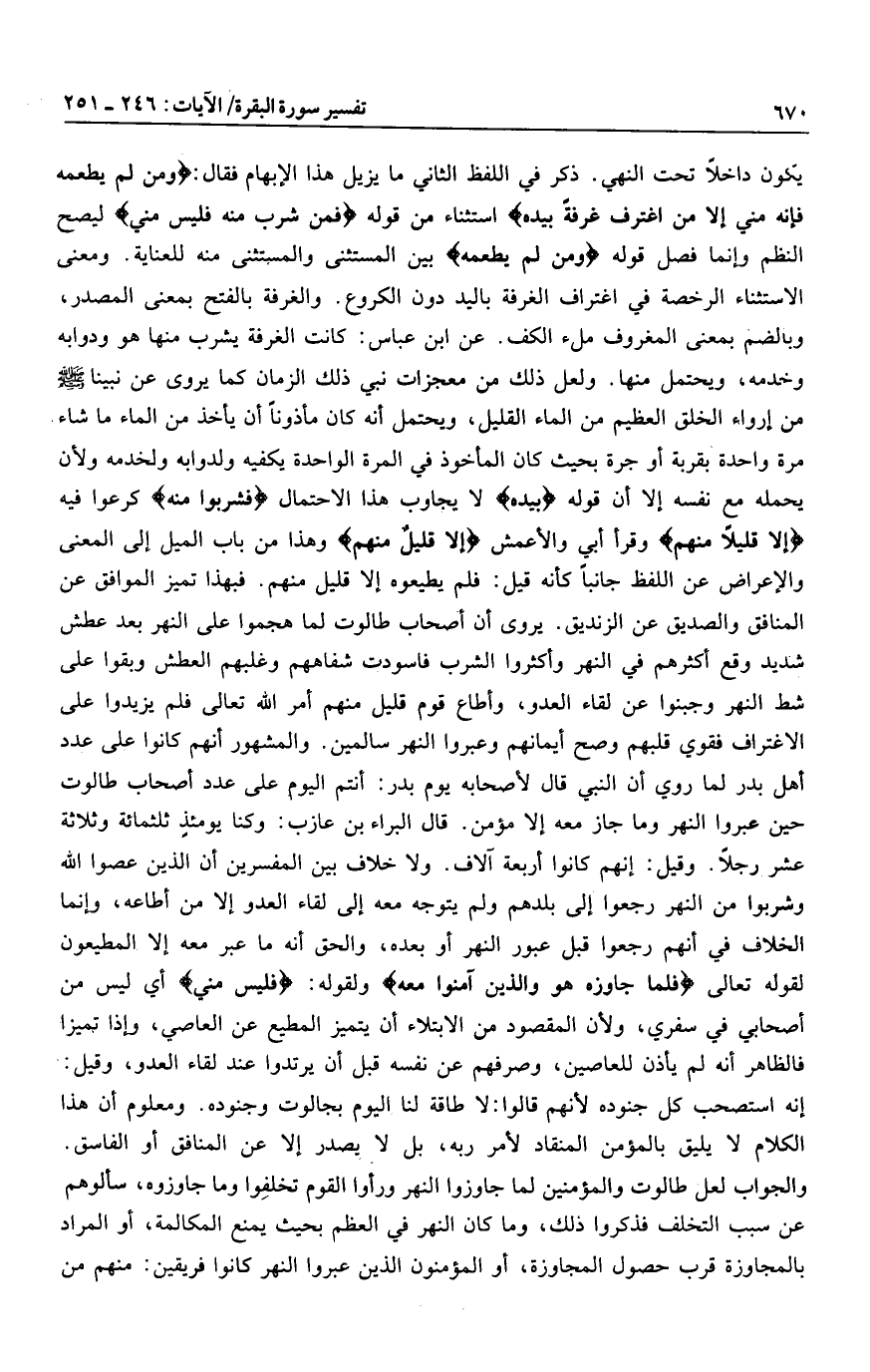 ويحتمل أنه كان مأذونا أن يأخذ من الماء ما شاء مرة واحدة بقربة أو جرة بحيث كان المأخوذ في المرة الواحدة يكفيه ولدوابه ولخدمه ولأن يحمله مع نفسه إلا أن قوله بِيَدِهِ لا يجاوب هذا الاحتمال فَشَرِبُوا مِنْهُ كرعوا فيه إِلَّا قَلِيلًا مِنْهُمْ وقرأ أبي والأعمش إِلَّا قَلِيلٌ مِنْهُمْ وهذا من باب الميل إلى المعنى والإعراض عن اللفظ جانبا كأنه قيل: فلم يطيعوه إلا قليل منهم. فبهذا تميز الموافق عن المنافق والصديق عن الزنديق.