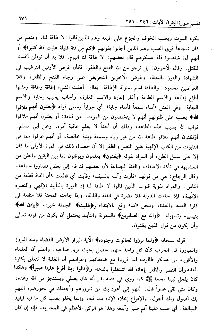 قوله سبحانه وَلَمَّا بَرَزُوا لِجالُوتَ وَجُنُودِهِ الآية البراز الأرض الفضاء ومنه البروز والمبارزة في الحرب كأن كل واحد منهما حصل بحيث يرى صاحبه. واعلم أن العلماء والأقوياء من عسكر طالوت لما قرروا مع ضعفائهم وعوامهم أن الغلبة لا تتعلق بكثرة العدد وأن النصر والظفر بإعانة الله اشتغلوا بالدعاء وقالُوا رَبَّنا أَفْرِغْ عَلَيْنا صَبْراً وهكذا كان يفعل نبينا محمد صلى الله عليه وسلم كما