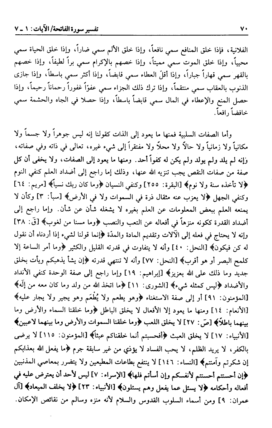 وأما الصفات السلبية فمنها ما يعود إلى الذات كقولنا إنه ليس جوهرا ولا جسما ولا مكانيا ولا زمانيا ولا حالا ولا محلا ولا مفتقرا إلى شيء غيره، تعالى في ذاته وفي صفاته، وإنه لم يلد ولم يولد ولم يكن له كفوا أحد. ومنها ما يعود إلى الصفات، ولا يخفى أن كل صفة من صفات النقص يجب تنزيه الله عنها، وذلك إما راجع إلى أضداد العلم كنفي النوم لا تَأْخُذُهُ سِنَةٌ وَلا نَوْمٌ [البقرة: 255] وكنفي النسيان وَما كانَ رَبُّكَ نَسِيًّا [مريم: 64] وكنفي الجهل لا يَعْزُبُ عَنْهُ مِثْقالُ ذَرَّةٍ فِي السَّماواتِ وَلا فِي الْأَرْضِ [سبأ: 3] وكأن لا يمنعه العلم ببعض المعلومات عن العلم بغيره لا يشغله شأن عن شأن. وإما راجع إلى أضداد القدرة ككونه منزها في أفعاله عن التعب والنصب وَما مَسَّنا مِنْ لُغُوبٍ [ق: 38] وإنه لا يحتاج في فعله إلى الآلات وتقديم المادة والمدّة إِنَّما قَوْلُنا لِشَيْءٍ إِذا أَرَدْناهُ أَنْ نَقُولَ لَهُ كُنْ فَيَكُونُ [النحل: 40] وأنه لا يتفاوت في قدرته القليل والكثير وَما أَمْرُ السَّاعَةِ إِلَّا كَلَمْحِ الْبَصَرِ أَوْ هُوَ أَقْرَبُ [النحل: 77] وأنه لا تنتهي قدرته إِنْ يَشَأْ يُذْهِبْكُمْ وَيَأْتِ بِخَلْقٍ جَدِيدٍ وَما ذلِكَ عَلَى اللَّهِ بِعَزِيزٍ [إبراهيم: 19] وإما راجع إلى صفة الوحدة كنفي الأنداد والأضداد لَيْسَ كَمِثْلِهِ شَيْءٌ [الشورى: 11] مَا اتَّخَذَ اللَّهُ مِنْ وَلَدٍ وَما كانَ مَعَهُ مِنْ إِلهٍ [المؤمنون: 91] أو إلى صفة الاستغناء وَهُوَ يُطْعِمُ وَلا يُطْعَمُ وَهُوَ يُجِيرُ وَلا يُجارُ عَلَيْهِ [الأنعام: 14] ومنها ما يعود إلا الأفعال لا يخلق الباطل وَما خَلَقْنَا السَّماءَ وَالْأَرْضَ وَما بَيْنَهُما باطِلًا [ص: 27] لا يخلق اللعب وَما خَلَقْنَا السَّماواتِ وَالْأَرْضَ وَما بَيْنَهُما لاعِبِينَ [الأنبياء: 17] لا يخلق العبث أَفَحَسِبْتُمْ أَنَّما خَلَقْناكُمْ عَبَثاً [المؤمنون: 115] لا يرضى بالكفر، لا يريد الظلم، لا يحب الفساد لا يؤذي من غير سابقة جرم ما يَفْعَلُ اللَّهُ بِعَذابِكُمْ إِنْ شَكَرْتُمْ وَآمَنْتُمْ [النساء: 146] لا ينتفع بطاعات المطيعين ولا يتضرر بمعاصي المذنبين إِنْ أَحْسَنْتُمْ أَحْسَنْتُمْ لِأَنْفُسِكُمْ وَإِنْ أَسَأْتُمْ فَلَها [الإسراء: 7] ليس لأحد أن يعترض عليه في أفعاله وأحكامه لا يُسْئَلُ عَمَّا يَفْعَلُ وَهُمْ يُسْئَلُونَ [الأنبياء: 23] لا يُخْلِفُ الْمِيعادَ [آل عمران: 9] ومن أسماء السلوب القدوس والسلام لأنه منزه وسالم من نقائص الإمكان.