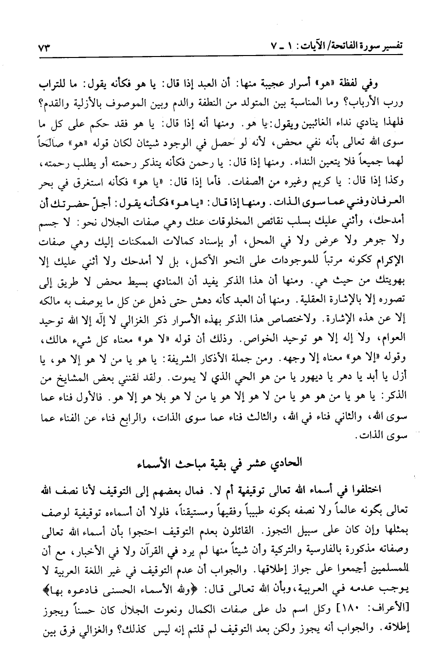 الحادي عشر في بقية مباحث الأسماء اختلفوا في أسماء الله تعالى توقيفية أم لا. فمال بعضهم إلى التوقيف لأنا نصف الله تعالى بكونه عالما ولا نصفه بكونه طبيبا وفقيها ومستيقنا، فلولا أن أسماءه توقيفية لوصف بمثلها وإن كان على سبيل التجوز. القائلون بعدم التوقيف احتجوا بأن أسماء الله تعالى وصفاته مذكورة بالفارسية والتركية وأن شيئا منها لم يرد في القرآن ولا في الأخبار، مع أن المسلمين أجمعوا على جواز إطلاقها. والجواب أن عدم التوقيف في غير اللغة العربية لا يوجب عدمه في العربية، وبأن الله تعالى قال: وَلِلَّهِ الْأَسْماءُ الْحُسْنى فَادْعُوهُ بِها [الأعراف: 180] وكل اسم دل على صفات الكمال ونعوت الجلال كان حسنا ويجوز إطلاقه. والجواب أنه يجوز ولكن بعد التوقيف لم قلتم إنه ليس كذلك؟ والغزالي فرق بين