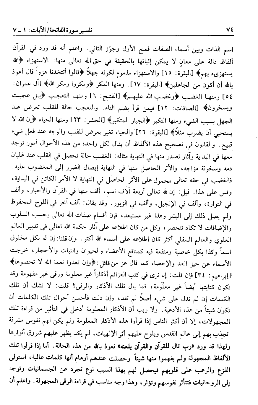 54] ومنها الغضب وَغَضِبَ اللَّهُ عَلَيْهِمْ [الفتح: 6] ومنها التعجب بَلْ عَجِبْتَ وَيَسْخَرُونَ [الصافات: 12] فيمن قرأ بضم التاء. والتعجب حالة للقلب تعرض عند الجهل بسبب الشيء ومنها التكبر الْجَبَّارُ الْمُتَكَبِّرُ [الحشر: 23] ومنها الحياء إِنَّ اللَّهَ لا يَسْتَحْيِي أَنْ يَضْرِبَ مَثَلًا [البقرة: 26] والحياء تغير يعرض للقلب والوجه عند فعل شيء قبيح. والقانون في تصحيح هذه الألفاظ أن يقال لكل واحدة من هذه الأحوال أمور توجد معها في البداية وآثار تصدر منها في النهاية مثاله: الغضب حالة تحصل في القلب عند غليان دمه وسخونة مزاجه، والأثر الحاصل منها في النهاية إيصال الضرر إلى المغضوب عليه.