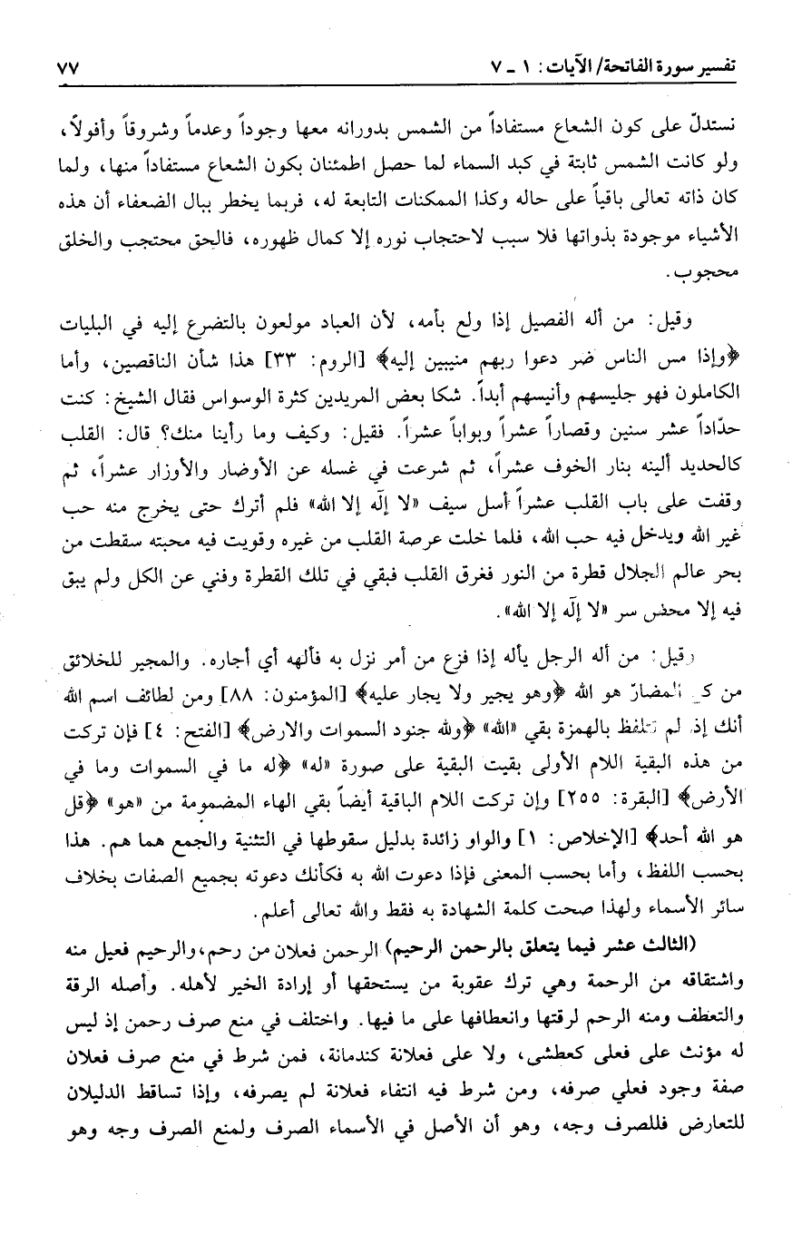 وقيل: من أله الفصيل إذا ولع بأمه، لأن العباد مولعون بالتضرع إليه في البليات وَإِذا مَسَّ النَّاسَ ضُرٌّ دَعَوْا رَبَّهُمْ مُنِيبِينَ إِلَيْهِ [الروم: 33] هذا شأن الناقصين، وأما الكاملون فهو جليسهم وأنيسهم أبدا. شكا بعض المريدين كثرة الوسواس فقال الشيخ: كنت حدّادا عشر سنين وقصارا عشرا وبوابا عشرا. فقيل: وكيف وما رأينا منك؟ قال: القلب كالحديد ألينه بنار الخوف عشرا، ثم شرعت في غسله عن الأوضار والأوزار عشرا، ثم وقفت على باب القلب عشرا أسل سيف «لا إله إلا الله» فلم أترك حتى يخرج منه حب غير الله ويدخل فيه حب الله، فلما خلت عرصة القلب من غيره وقويت فيه محبته سقطت من بحر عالم الحلال قطرة من النور فغرق القلب فبقي في تلك القطرة وفني عن الكل ولم يبق فيه إلا محض سر «لا إله إلا الله» .