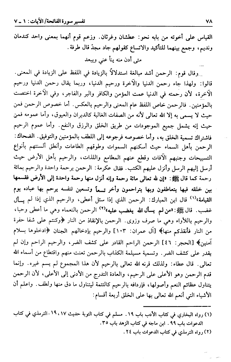 الرحمن بالنعماء وهي ما أعطى وحبا، والرحيم باللأواء وهي ما صرف وزوى. الرحمن بالإنقاذ من النار وَكُنْتُمْ عَلى شَفا حُفْرَةٍ مِنَ النَّارِ فَأَنْقَذَكُمْ مِنْها [آل عمران: 103] والرحيم بإدخالهم الجنان ادْخُلُوها بِسَلامٍ آمِنِينَ [الحجر: 46] الرحمن الراحم القادر على كشف الضر، والرحيم الراحم وإن لم يقدر على كشف الضر. وتسمية مسيلمة الكذاب بالرحمن تعنت منهم واقتطاع من أسماء الله تعالى. قال عطاء: ولذلك قرنه الله تعالى بالرحيم لأن هذا المجموع لم يسم غيره. وإنما قدم الرحمن وهو الأعلى على الرحيم، والعادة التدرج من الأدنى إلى الأعلى، لأن الرحمن يتناول عظائم النعم وأصولها، فإردافه بالرحيم كالتتمة ليتناول ما دق منها ولطف. واعلم أن الأشياء التي أنعم الله تعالى بها على الخلق أربعة أقسام: