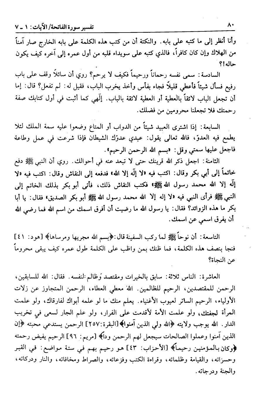 التاسعة: أن نوحا صلى الله عليه وسلم لما ركب السفينة قال: بِسْمِ اللَّهِ مَجْراها وَمُرْساها [هود: 41] فنجا بنصف هذه الكلمة، فما ظنك بمن واظب على الكلمة طول عمره كيف يبقى محروما عن النجاة؟