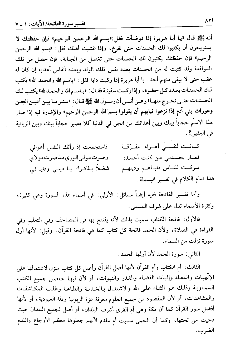 وأما تفسير الفاتحة ففيه أيضا مسائل: الأولى: في أسماء هذه السورة وهي كثيرة، وكثرة الأسماء تدل على شرف المسمى.