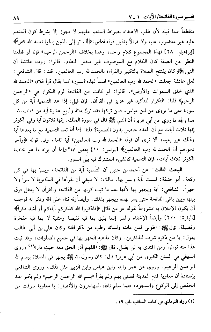 البحث الثالث: عن أحمد بن حنبل أن التسمية آية من الفاتحة، ويسرّ بها في كل ركعة. أبو حنيفة: ليست بآية ويسر بها. مالك: لا ينبغي أن يقرأها في المكتوبة لا سرا ولا جهرا. الشافعي: آية ويجهر بها لأنها بعد ما ثبت كونها من الفاتحة والقرآن لا يعقل فرق بينها وبين باقي الفاتحة حتى يسر بهذه ويجهر بذلك. وأيضا إنه ثناء على الله وذكر له فوجب أن يكون الإعلان به مشروعا لقوله عز من قائل فَاذْكُرُوا اللَّهَ كَذِكْرِكُمْ آباءَكُمْ أَوْ أَشَدَّ ذِكْراً [البقرة: 200] وأيضا الإخفاء والسر إنما يليق بما فيه نقيصة ومثلبة لا بما فيه مفخرة وفضيلة.