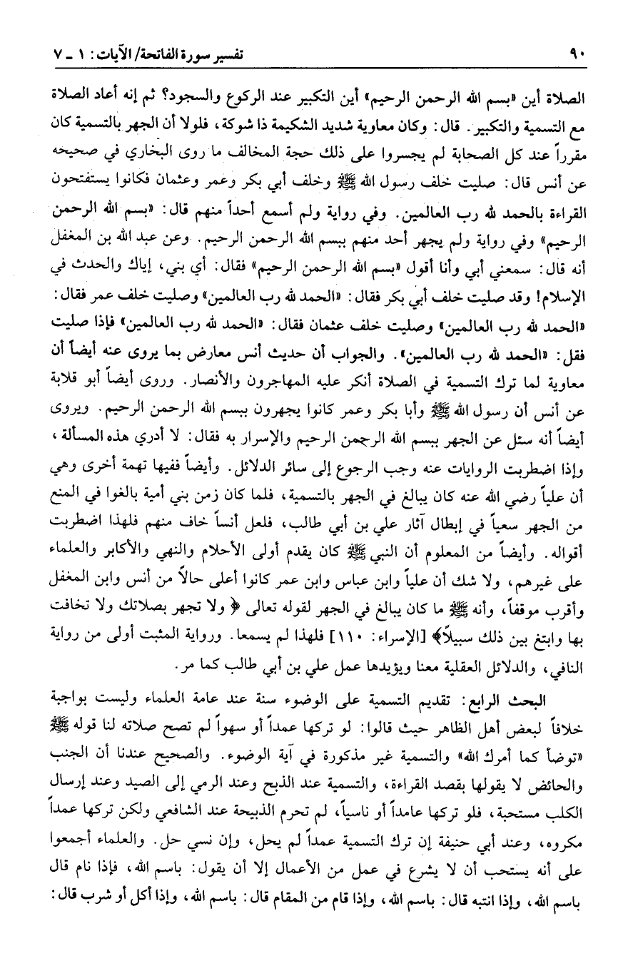 الصلاة أين «بسم الله الرحمن الرحيم» أين التكبير عند الركوع والسجود؟ ثم إنه أعاد الصلاة مع التسمية والتكبير. قال: وكان معاوية شديد الشكيمة ذا شوكة، فلولا أن الجهر بالتسمية كان مقررا عند كل الصحابة لم يجسروا على ذلك حجة المخالف ما روى البخاري في صحيحه عن أنس قال: صليت خلف رسول الله صلى الله عليه وسلم وخلف أبي بكر وعمر وعثمان فكانوا يستفتحون القراءة بالحمد لله رب العالمين. وفي رواية ولم أسمع أحدا منهم قال: «بسم الله الرحمن الرحيم» وفي رواية ولم يجهر أحد منهم ببسم الله الرحمن الرحيم. وعن عبد الله بن المغفل أنه قال: سمعني أبي وأنا أقول «بسم الله الرحمن الرحيم» فقال: أي بني، إياك والحدث في الإسلام! وقد صليت خلف أبي بكر فقال: «الحمد لله رب العالمين» وصليت خلف عمر فقال: