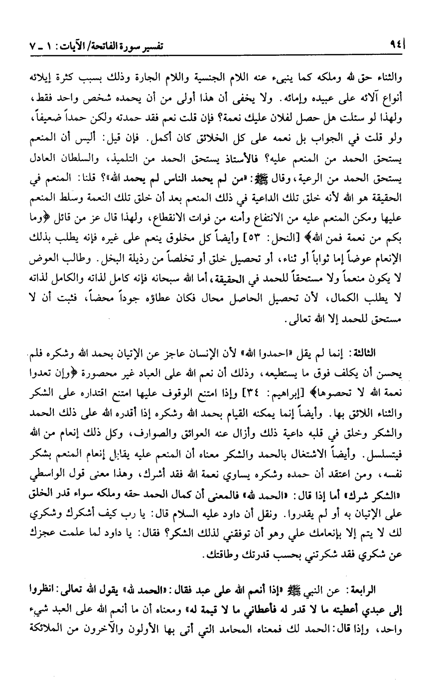 والثناء حق لله وملكه كما ينبىء عنه اللام الجنسية واللام الجارة وذلك بسبب كثرة إيلائه أنواع آلائه على عبيده وإمائه. ولا يخفى أن هذا أولى من أن يحمده شخص واحد فقط، ولهذا لو سئلت هل حصل لفلان عليك نعمة؟ فإن قلت نعم فقد حمدته ولكن حمدا ضعيفا، ولو قلت في الجواب بل نعمه على كل الخلائق كان أكمل. فإن قيل: أليس أن المنعم يستحق الحمد من المنعم عليه؟ فالأستاذ يستحق الحمد من التلميذ، والسلطان العادل يستحق الحمد من الرعية،
