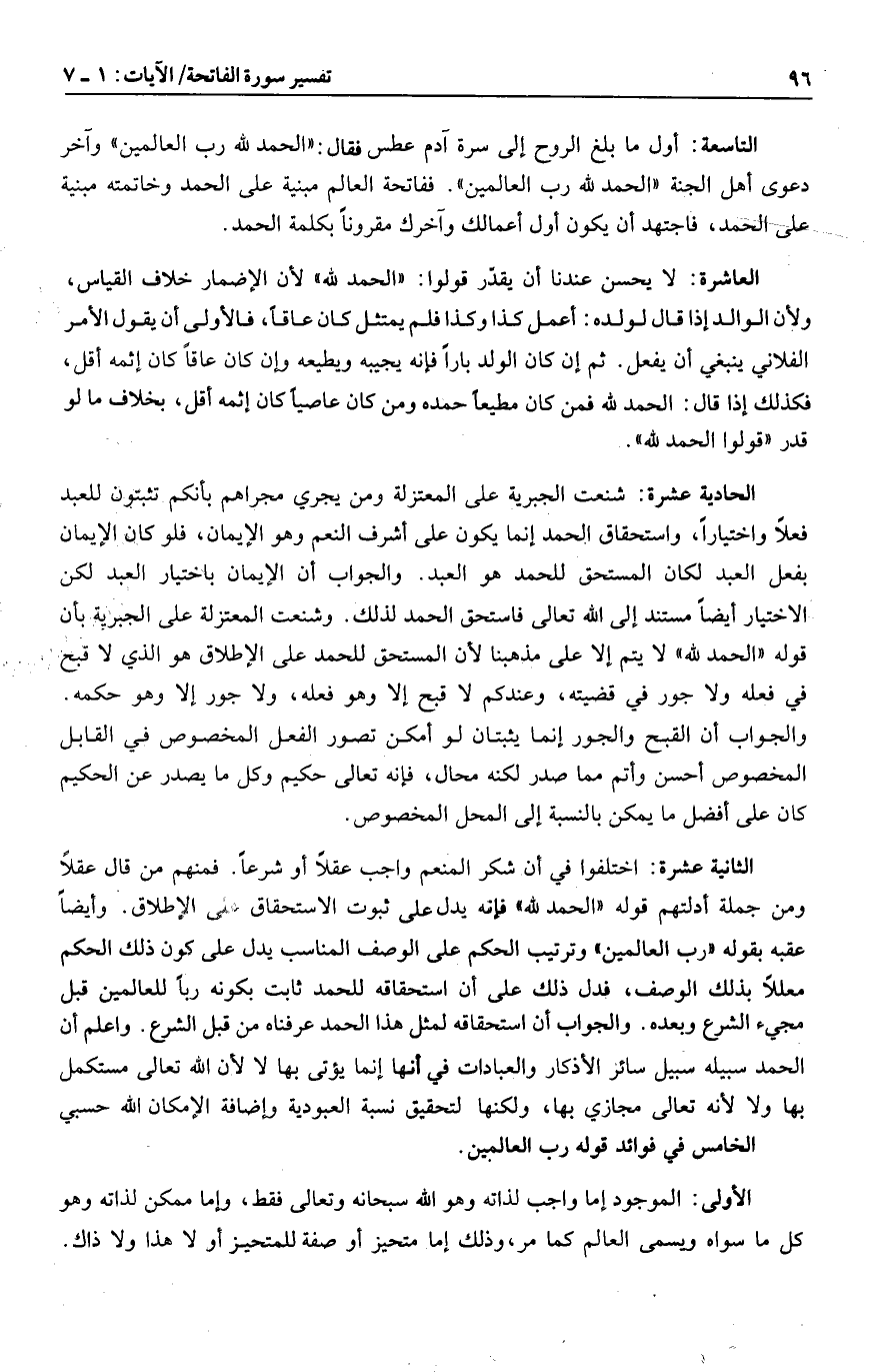 الحادية عشرة: شنعت الجبرية على المعتزلة ومن يجري مجراهم بأنكم تثبتون للعبد فعلا واختيارا، واستحقاق الحمد إنما يكون على أشرف النعم وهو الإيمان، فلو كان الإيمان بفعل العبد لكان المستحق للحمد هو العبد. والجواب أن الإيمان باختيار العبد لكن الاختيار أيضا مستند إلى الله تعالى فاستحق الحمد لذلك. وشنعت المعتزلة على الجبرية بأن قوله «الحمد لله» لا يتم إلا على مذهبنا لأن المستحق للحمد على الإطلاق هو الذي لا قبح في فعله ولا جور في قضيته، وعندكم لا قبح إلا وهو فعله، ولا جور إلا وهو حكمه.