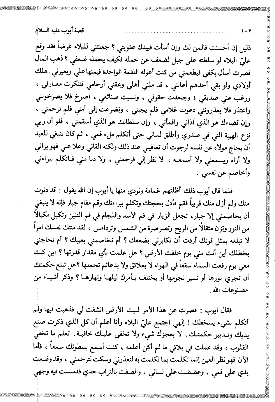 فقال أيوب قصرت عن هذا الأمر ليت الأرض انشقت لي فذهبت فيها ولم أتكلم بشيء يسخطك إلهي اجتمع علي البلاء وأنا أعلم أن كل الذي ذكرت صنع يديك وتدبير حكمتك لا يعجزك شيء ولا تخفي عليك خافية تعلم ما تخفي القلوب وقد علمت في بلائي ما لم أكن اعلمه كنت أسمع بسطوتك سمعا فاما الآن فهو نظر العين إنما تكلمت بما تكملت به لتعذرني وسكت لترحمني وقد وضعت يدي على فمي وعضضت على لساني والصقت بالتراب خدي فدسست فيه وجهي