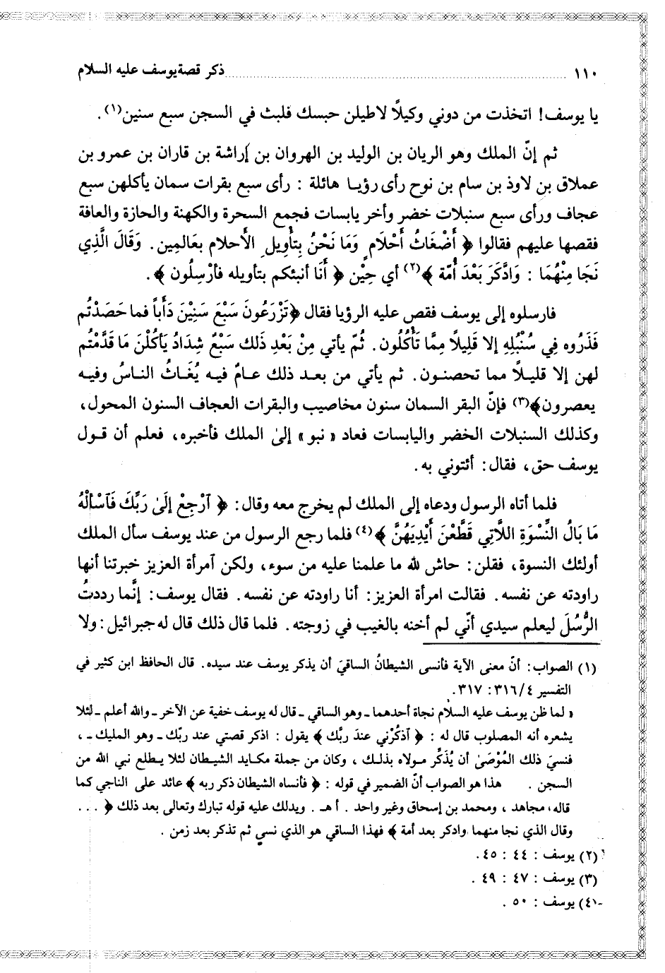 ثم إن الملك وهو الريان بن الوليد بن الهروان بن إراشة بن قاران بن عمرو بن عملاق بن لاوذ بن سام بن نوح رأى رؤية هائلة رأى سبع بقرات سمان يأكلهن سبع عجاف ورأى سبع سنبلات خضر وأخر يابسات فجمع السحرة والكهنة والحازة والعافة فقصها عليهم فقالوا { أضغاث أحلام وما نحن بتأويل الأحلام بعالمين وقال الذي نجا منهما وادكر بعد أمة } أي حين { أنا أنبئكم بتأويله فأرسلون }