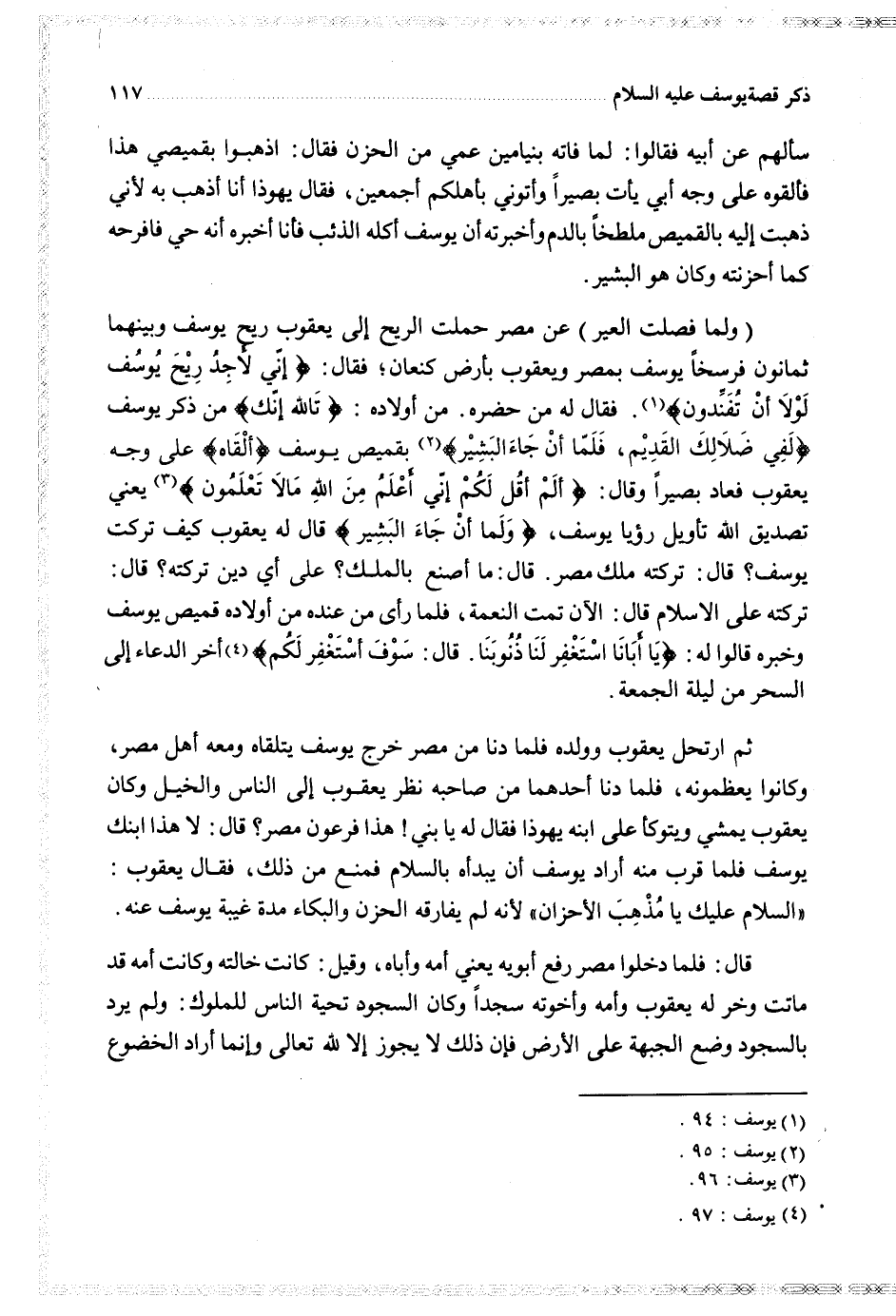 سألهم عن أبيه فقالوا لما فاته بنيامين عمي من الحزن فقال اذهبوا بقميصي هذا فألقوه على وجه أبي يأت بصيرا وأتوني بأهلكم أجمعين فقال يهوذا أنا أذهب به لأني ذهبت إليه بالقميص ملطخا بالدم وأخبرته أن يوسف أكله الذئب فأنا أخبره أنه حي فافرحه كما أحزنته وكان هو البشير