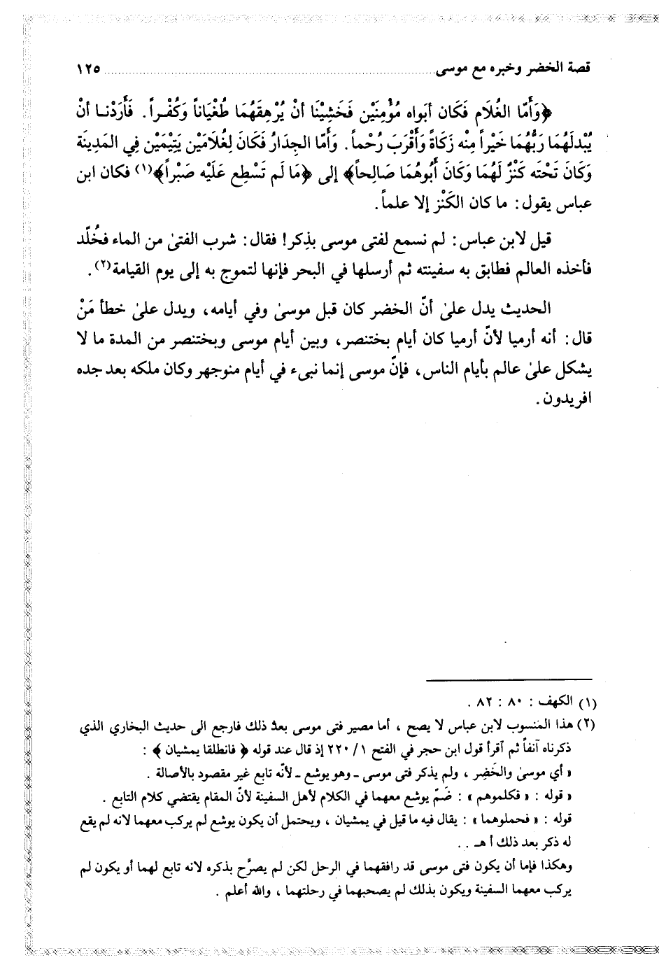 { وأما الغلام فكان أبواه مؤمنين فخشينا أن يرهقهما طغيانا وكفرا فأردنا أن يبدلهما ربهما خيرا منه زكاة وأقرب رحما وأما الجدار فكان لغلامين يتيمين في المدينة وكان تحته كنز لهما وكان أبوهما صالحا } إلى { ما لم تستطع عليه صبرا } فكان ابن عباس يقول ما كان الكنز إلا علما