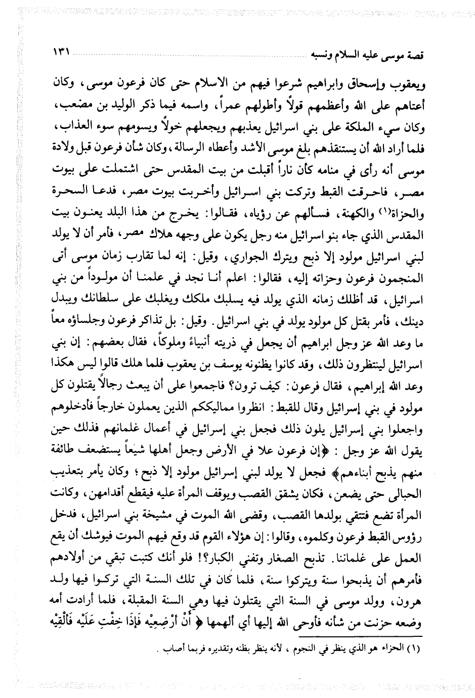 ويعقوب وإسحاق وإبراهيم شرعوا فيهم من الاسلام حتى كان فرعون موسى وكان أعتاهم على الله وأعظمهم قولا وأطولهم عمرا واسمه فيما ذكر الوليد بن مصعب وكان سيء الملكة على بني إسرائيل يعذبهم ويجعلهم خولا ويسوموهم سوء العذاب فلما أراد الله أن يستنقذهم بلغ موسى الأشد وأعطاه الرسالة وكان شأن فرعون قبل ولادة موسى أنه رأى في منامه كأن نارا أقبلت من بيت المقدس حتى اشتملت على بيوت مصر فاحرقت القبط وتركت بني إسرائيل وأخربت بيوت مصر فدعا السحرة والحزاة والكهنة فسألهم عن رؤياه فقالوا يخرج من هذا البلد يعنون بيت المقدس الذي جاء بنو إسرائيل منه رجل يكون على وجهه هلاك مصر فأمر ألا يولد لبني إسرائيل مولود إلا ذبح ويترك الجواري وقيل إنه لما تقارب زمان موسى أتى المنجمون فرعون وحزاته إليه فقالوا اعلم أنا نجد في علمنا أن مولودا من بني إسرائيل قد أظلك زمانه الذي يولد فيه يسلبك ملكك ويغلبك على سلطانك ويبدل دينك فأمر بقتل كل مولود يولد في بني إسرائيل وقيل بل تذاكر فرعون وجلساؤه معا ما وعد الله عز وجل إبراهيم أن يجعل في ذريته أنبياء وملوكا فقال بعضهم إن بني إسرائيل لينتظرون ذلك وقد كانوا يظنونه يوسف بن يعقوب فلما هلك قالوا ليس هكذا وعد الله إبراهيم فقال فرعون كيف ترون فاجمعوا على أن يبعث رجالا يقتلون كل مولود في بني إسرائيل وقال للقبط انظروا مماليككم الذين يعملون خارجا فأدخلوهم واجعلوا بني إسرائيل يلون ذلك فجعل بني إسرائيل في أعمال غلمانهم فذلك حين يقول الله عز وجل { إن فرعون علا في الأرض وجعل أهلها شيعا يستضعف طائفة منهم يذبح أبناءهم } فجعل لا يولد لبني إسرائيل مولود إلا ذبح وكان يأمر بتعذيب الحبالى حتى يضعن فكان يشقق القصب ويوقف المرأة عليه فيقطع أقدامهن وكانت المرأة تضع فتتقي بولدها القصب وقضى الله الموت في مشيخة بني إسرائيل فدخل رؤوس القبط فرعون وكلموه وقالوا إن هؤلاء القوم قد وقع فيهم الموت فيوشك أن يقع العمل على غلماننا تذبح الصغار وتفني الكبار فلو أنك كتبت تبقي من أولادهم فأمرهم أن يذبحوا سنة ويتركوا سنة فلما كان في تلك السنة التي تركوا فيها ولد هرون وولد موسى في السنة التي يقتلون فيها وهي السنة المقبلة فلما أرادت أمه وضعه حزنت من شأنه فأوحى الله إليها أي ألهمها { أن أرضعيه فإذا خفت عليه فألقيه في اليم }