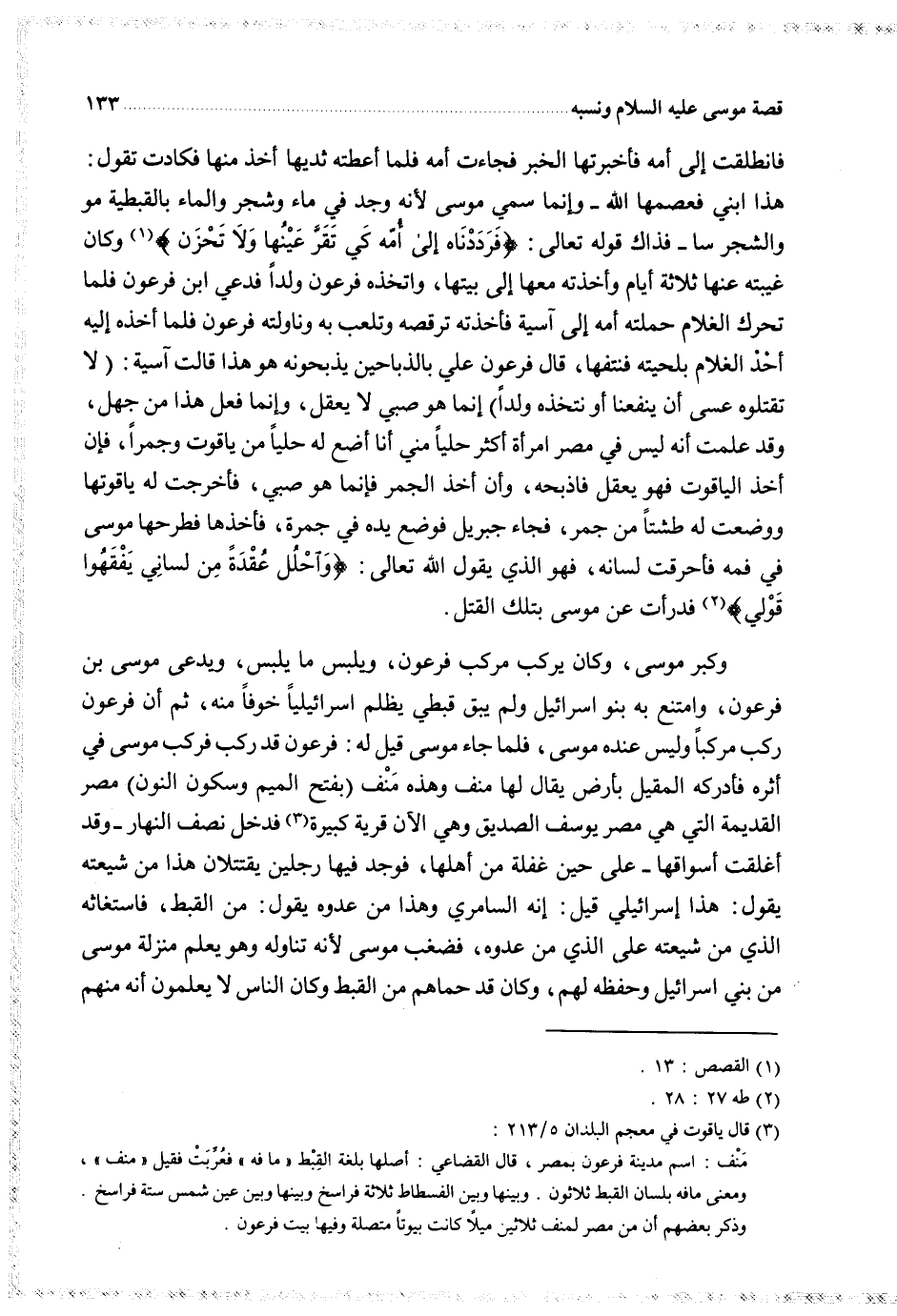 وكبر موسى وكان يركب مركب فرعون ويلبس ما يلبس ويدعى موسى بن فرعون وامتنع به بنو إسرائيل ولم يبق قبطي يظلم اسرائيليا خوفا منه ثم أن فرعون ركب مركبا وليس عنده موسى فلما جاء موسى قيل له فرعون قد ركب فركب موسى في أثره فأدركته المقيل بأرض يقال لها منف وهذه منف ( بفتح الميم وسكون النون ) مصر القديمة التي هي مصر يوسف الصديق وهي الآن قرية كبيرة فدخل نصف النهار وقد أغلقت أسواقها على حين غفلة من أهلها فوجد فيها رجلين يقتتلان هذا من شيعته يقول هذا إسرائيلي قيل إنه السامري وهذا من عدوه يقول من القبط فاستغاثه الذي من شيعته على الذي من عدوه فضغب موسى لأنه تناوله وهو يعلم منزلة موسى من بني إسرائيل وحفظه لهم وكان قد حماهم من القبط وكان الناس لا يعلمون أنه منهم