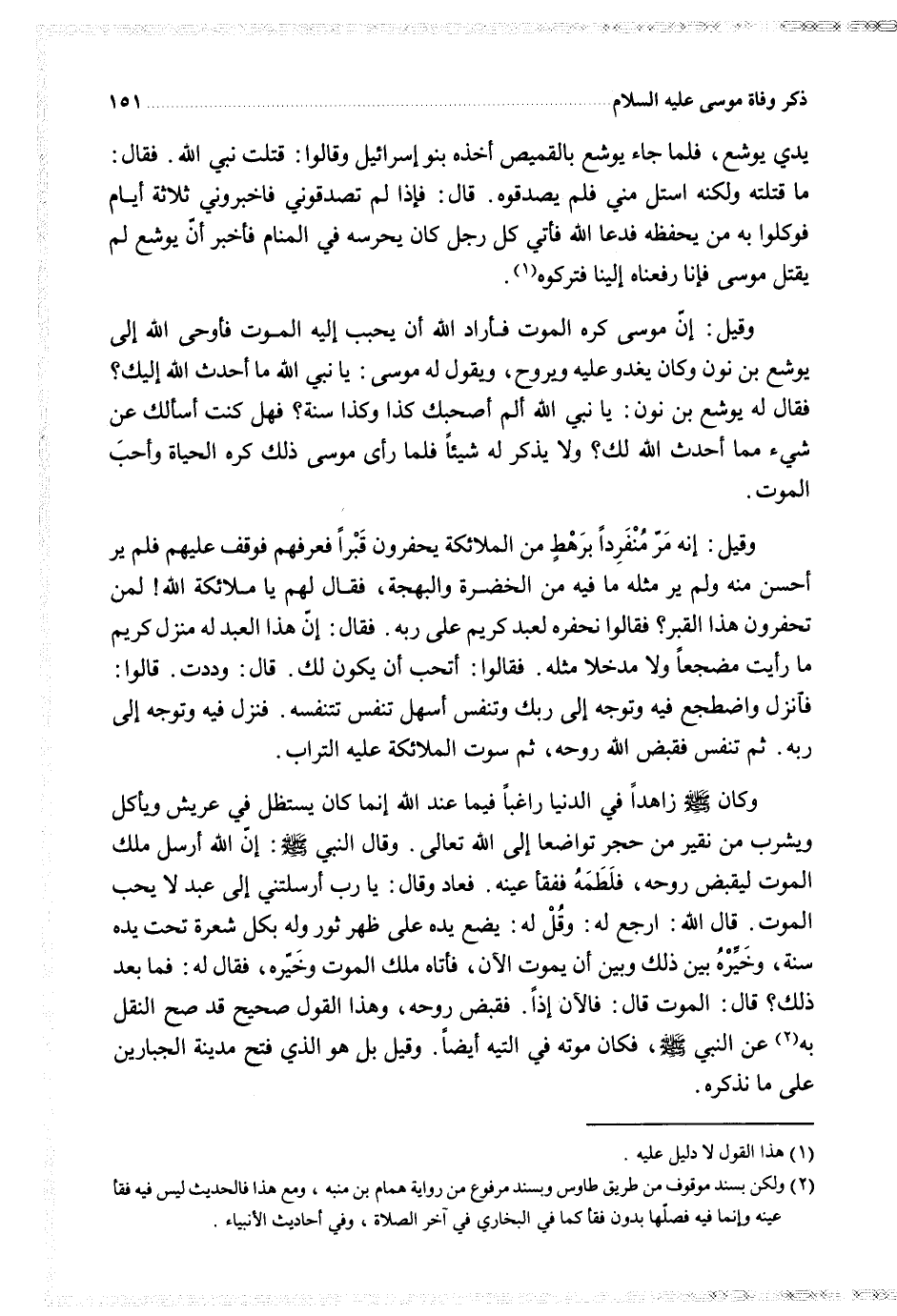 وكان زاهدا في الدنيا راغبا فيما عند الله إنما كان يستظل في عريش ويأكل ويشرب من نقير من حجر تواضعا إلى الله تعالى وقال النبي إن الله أرسل ملك الموت ليقبض روحه فلطمه ففقأ عينه فقاد وقال يا رب أرسلتني إلى عبد لا يحب الموت قال الله ارجع له وقل له يضع يده على ظهر ثور وله بكل شعرة تحت يده سنة وخيره بين ذلك وبين أن يموت الآن فأتاه ملك الموت وخيره فقال له فما بعد ذلك قال الموت قال فالآن إذا فقبض روحه وهذا القول صحيح قد صح النقل به عن النبي فكان موته في التيه أيضا وقيل بل هو الذي فتح مدينة الجبارين على ما نذكره