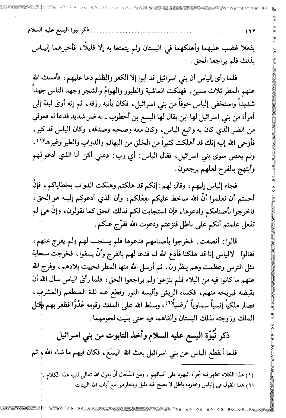 قالوا أنصفت فخرجوا بأصنامهم فدعوها فلم يستجب لهم ولم يفرج عنهم فقالوا لالياس إنا قد هلكنا فادع الله لنا فدعا لهم بالفرج وأن يسقوا فخرجت سحابة مثل الترس وعظمت وهم ينظرون ثم أرسل الله منها المطر فحييت بلادهم وفرج الله عنهم ما كانوا فيه من البلاء فلم ينزعوا ولم يراجعوا الحق فلما رأى إلياس سأل الله أن يقبضه فيريحه منهم فكساه الريش وألبسه النور وقطع عنه لذة المطعم والمشرب فصار ملكيا إنسيا سماويا أرضيا وسلط الله على الملك وقومه عدوا فظفر بهم وقتل الملك وزوجته بذلك البستان وألقاهما فيه حتى بليت لحومهما