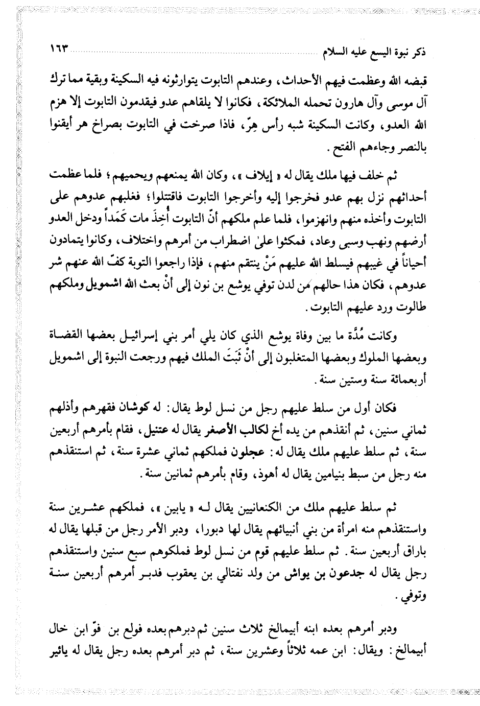 ثم خلف فيها ملك يقال له إيلاف وكان الله يمنعهم ويحميهم فلما عظمت أحداثهم نزل بهم عدو فخرجوا إليه وأخرجوا التابوت فاقتتلوا فغلبهم عدوهم على التابوت وأخذه منهم وانهزموا فلما علم ملكهم أن التابوت أخذ مات كمدا ودخل العدو أرضهم ونهب وسبى وعاد فمكثوا على اضطراب من أمرهم واختلاف وكانوا يتمادون أحيانا في غيبهم فيسلط الله عليهم من ينتقم منهم فإذا راجعوا التوبة كف الله عنهم شر عدوهم فكان هذا حالهم من لدن توفي يوشع بن نون إلى أن بعث الله اشمويل وملكهم طالوت ورد عليهم التابوت