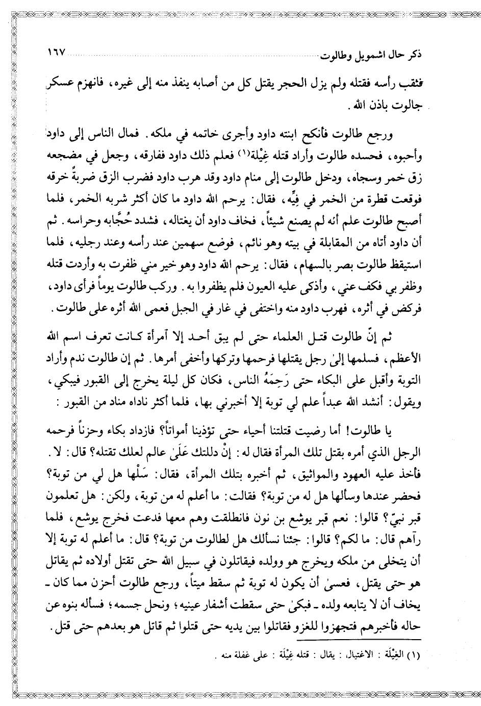 ثم إن طالوت قتل العلماء حتى لم يبق أحد إلا امرأة كانت تعرف اسم الله الأعظم فسلمها إلى رجل يقتلها فرحمها وتركها وأخفى أمرها ثم إن طالوت ندم وأراد التوبة وأقبل على البكاء حتى رحمه الناس فكان كل ليلة يخرج إلى القبور فيبكي ويقول أنشد الله عبدا علم لي توبة إلا أخبرني بها فلما أكثر ناداه مناد من القبور يا طالوت أما رضيت قتلتنا أحياء حتى لا تؤذينا أمواتا فازداد بكاء وحزنا فرحمه الرجل الذي أمره بقتل تلك المرأة فقال له إن دللتك على عالم لعلك تقتله قال لا فأخذ عليه العهود والمواثيق ثم أخبره بتك المرأة فقال سلها هل لي من توبة فحضر عندها وسألها هل له من توبة فقالت ما أعلم له من توبة ولكن هل تعلمون قبر نبي قالوا نعم قبر يوشع بن نون فانطلقت وهم معها فدعت فخرج يوشع فلما رآهم قال ما لكم قالوا جئنا نسألك هل لطالوت من توبة قال ما أعلم له توبة إلا أن يتخلى من ملكه ويخرج هو وولده فيقاتلون في سبيل الله حتى تقتل أولاده ثم يقاتل هو حتى يقتل فعسى أن يكون له توبة ثم سقط ميتا ورجع طالوت أحزن مما كان يخاف أن لا يتابعه ولده فبكى حتى سقطت أشفار عينيه ونحل جسمه فسألوه بنوه عن حاله فأخبرهم فتجهزوا للغزو فقاتلوا بين يديه حتى قتلوا ثم قاتل هو بعدهم حتى قتل