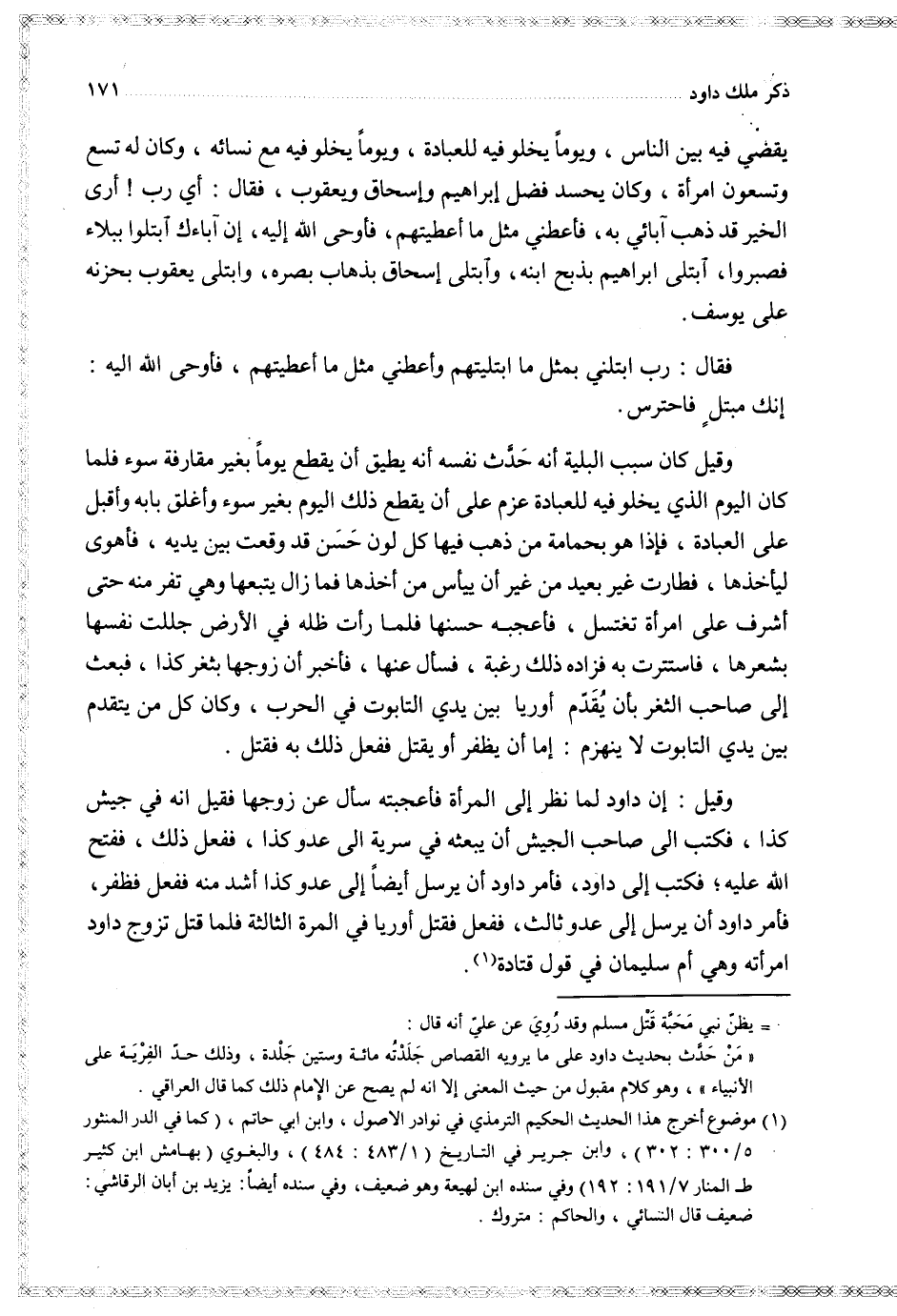 وقيل كان سبب البلية أنه حدث نفسه أنه يطيق أن يقطع يوما بغير مقارفة سوء فلما كان اليوم الذي يخلو فيه للعبادة عزم على أن يقطع ذلك اليوم بغير سوء وأغلق بابه وأقبل على العبادة فإذا هو بحمامة من ذهب فيها كل لون حسن قد وقعت بين يديه فأهوى ليأخذها فطارت غير بعيد من غير أن ييأس من أخذها فما زال يتبعها وهي تفر منه حتى أشرف على امرأة تغتسل فأعجبه حسنها فلما رأت ظله في الأرض جللت نفسها بشعرها فاستترت به فزاده ذلك رغبة فسأل عنها فأخبر أن زوجها بثغر كذا فبعث إلى صاحب الثغر بأن يقدم أوريا بين يدي التابوت في الحرب وكان كل من يتقدم بين يدي التابوت لا ينهزم إما أن يظفر أو يقتل ففعل ذلك به فقتل