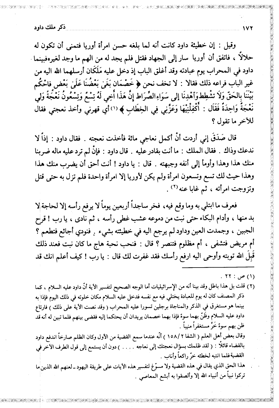 وقيل إن خطيئة داود كانت أنه لما بلغه حسن امرأة أوريا فتمنى أن تكون له حلالا فاتفق أن أوريا سار إلى الجهاد فقتل فلم يجد له من الهم ما وجد لغيره فبينما داود في المحراب يوم عبادته وقد أغلق الباب إذ دخل عليه ملكان أرسلهما الله إليه من غير الباب فراعه ذلك فقالا لا تخف نحن { خصمان بغى بعضنا على بعض فاحكم بيننا بالحق ولا تشطط واهدنا إلى سواء الصراط إن هذا أخي له تسع وتسعون نعجة ولي نعجة واحدة فقال أكفلنيها وعزني في الخطاب } أي قهرني وأخذ نعجتي فقال للآخر ما تقول