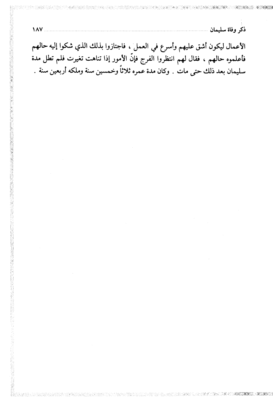 الأعمال ليكون أشق عليهم وأسرع في العمل فاجتازوا بذلك الذي شكوا إليه حالهم فأعلموه حالهم فقال لهم انتظروا الفرج فإن الأمور إذا تناهت تغيرت فلم تطل مدة سليمان بعد ذلك حتى مات وكان مدة عمره ثلاثة وخمسين سنة وملكه أربعين سنة