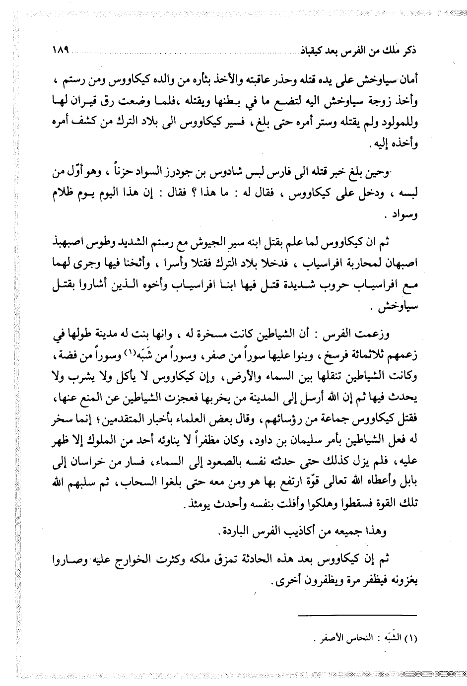 وزعمت الفرس أن الشياطين كانت مسخرة له وانها بنت له مدينة طولها في زعمهم ثلاثمائة فرسخ وبنوا عليها سورا من صفر وسورا من شبه وسورا من فضة وكانت الشياطين تنقلها بين السماء والأرض وإن كيكاووس لا يأكل ولا يشرب ولا يحدث فيها ثم إن الله أرسل إلى المدينة من يخربها فعجزت الشياطين عن المنع عنها فقتل كيكاووس جماعة من رؤسائهم وقال بعض العلماء بأخبار المتقدمين إنما سخر له فعل بأمر سليمان بن داود وكان مظفرا لا يناوئه أحد من الملوك إلا ظهر عليه فلم يزل كذلك حتى حدثته نفسه بالصعود إلى السماء فسار من خرسان إلى بابل وأعطاه الله تعالى قوة ارتفع بها هو ومن معه حتى بلغوا السحاب ثم سلبهم الله تلك القوة فسقطوا وهلكوا وأفلت بنفسه وأحدث يومئذ