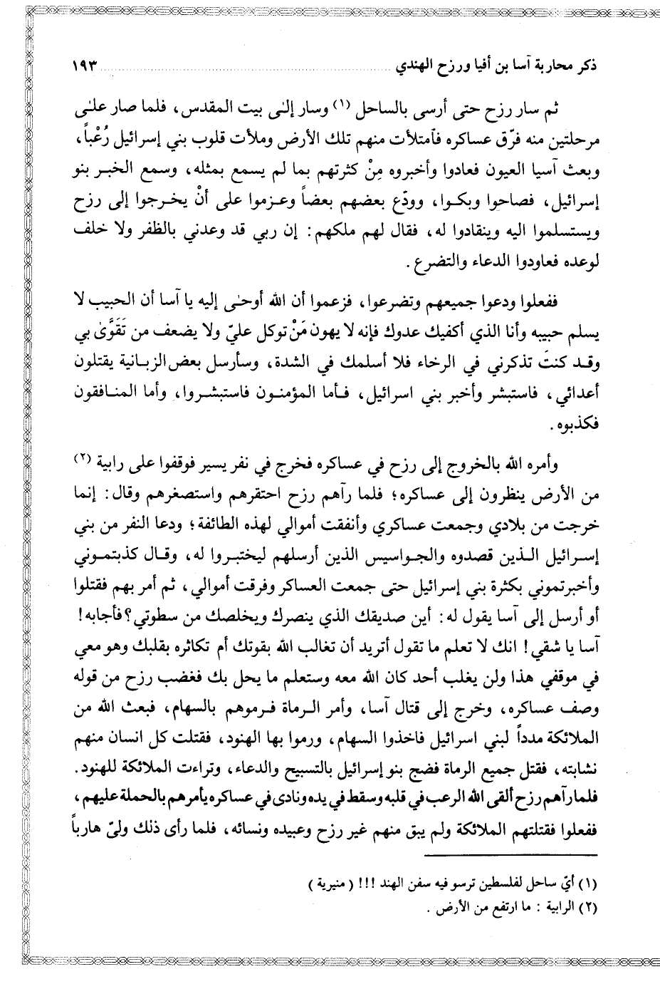 وأمره الله بالخروج إلى رزح في عساكره فخرج في نفر يسير على رابية من الأرض ينظرون إلى عساكره فلما رآهم رزح احتقرهم واستصغرهم وقال إنما خرجت من بلادي وجمعت عساكري وأنفقت أموالي لهذه الطائفة ودعا النفر من بني إسرائيل الذين قصدوه والجواسيس الذين أرسلهم ليختبروا له وقال كذبتموني وأخبرتموني بكثرة بني إسرائيل حتى جمعت العساكر وفرقت أموالي ثم أمر بهم فقتلوا أو أرسل إلى آسا يقول له أين صديقك الذي ينصرك ويخلصك من سطوتي فأجابه آسا يا شقي انك لا تعلم ما تقول أتريد أن تغالب الله بقوتك أم تكاثره بقلبك وهو معي في موقفي هذا ولن يغلب أحد كان الله معه وستعلم ما يحل بك فغضب رزح من قوله وصف عساكره وخرج إلى قتال آسا وأمر الرماة فرموهم بالسهام فبعث الله من الملائكة مددا لبني إسرائيل فأخذوا السهام ورموا بها الهنود فقتلت كل إنسان منهم نشابته فقتل جميع الرماة فضج بنو إسرائيل بالتسبيح والدعاء وتراءت الملائكة للهنود فلما رآهم رزح ألقى الله الرعب في قلبه وسقط في يده ونادى في عساكره يأمرهم بالحملة عليهم ففعلوا فقتلتهم الملائكة ولم يبق منهم غير رزح وعبيده ونسائه فلما رأى ذلك ولى هاربا