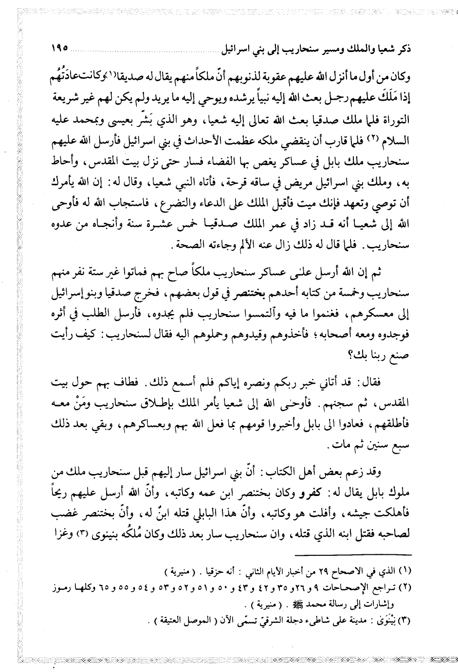 فقال قد أتاني خبر ربكم ونصره إياكم فلم أسمع ذلك فطاف بهم حول بيت المقدس ثم سجنهم فأوحى الله إلى شعيا يأمر الملك بإطلاق سنحاريب ومن معه فأطلقهم فعادوا إلى بابل وأخبروا قومهم بما فعل الله بهم وبعساكرهم وبقي بعد ذلك سبع سنين ثم مات