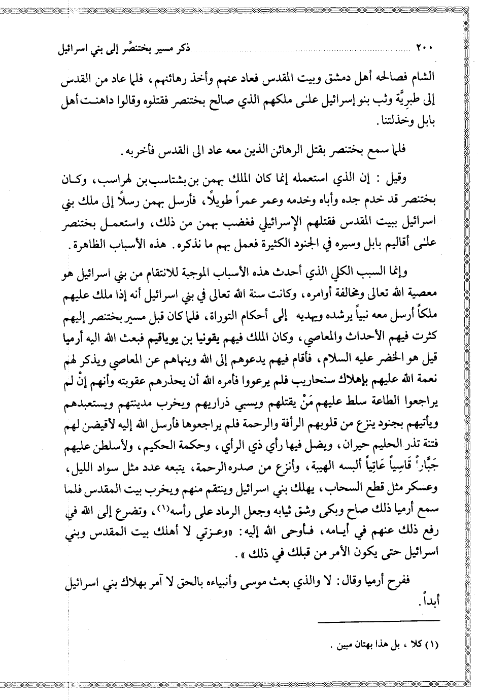 وإنما السبب الكلي الذي أحدث هذه الأسباب الموجبة للانتقام من بني إسرائيل هو معصية الله تعالى ومخالفة أوامره وكانت سنة الله تعالى في بني إسرائيل أنه إذا ملك عليهم ملكا أرسل الله معه نبيا يرشده ويهديه إلى أحكام التوراة فلما كان قبل مسير بختنصر إليهم كثرت فيهم الأحداث والمعاصي وكان الملك فيهم يقونيا بن يوياقيم فبعث الله إليه أرميا قيل هو الخضر عليه السلام فأقام فيهم يدعوهم إلى الله وينهاهم عن المعاصي ويذكر لهم نعمة الله عليهم بإهلاك سنحاريب فلم يرعووا فأمره الله أن يحذرهم عقوبته وأنهم إن لم يراجعوا الطاعة سلط عليهم من يقتلهم ويسبي ذراريهم ويخرب مدينته ويستعبدهم ويأتيهم بجنود ينزع من قلوبهم الرأفة والرحمة فلم يراجعوها فأرسل الله إليهم لأقيضن لهم فتنة تذر الحليم حيران ويضل فيها رأي ذي الرأي وحكمة الحكيم ولأسلطن عليهم جبارا قاسيا عاتيا ألبسه الهيبة وأنزع من صدره الرحمة يتبعه عدد مثل سواد الليل وعسكر مثل قطع السحاب يهلك بني إسرائيل وينتقم منهم ويخرب بيت المقدس فلما سمع أرميا ذلك صاح وبكى وشق ثيابه وجعل الرماد على رأسه وتضرع إلى الله في رفع ذلك عنهم في أيامه فأوحى الله إليه وعزتي لا أهلك بيت المقدس وبني إسرائيل حتى يكون الأمر من قبلك في ذلك )