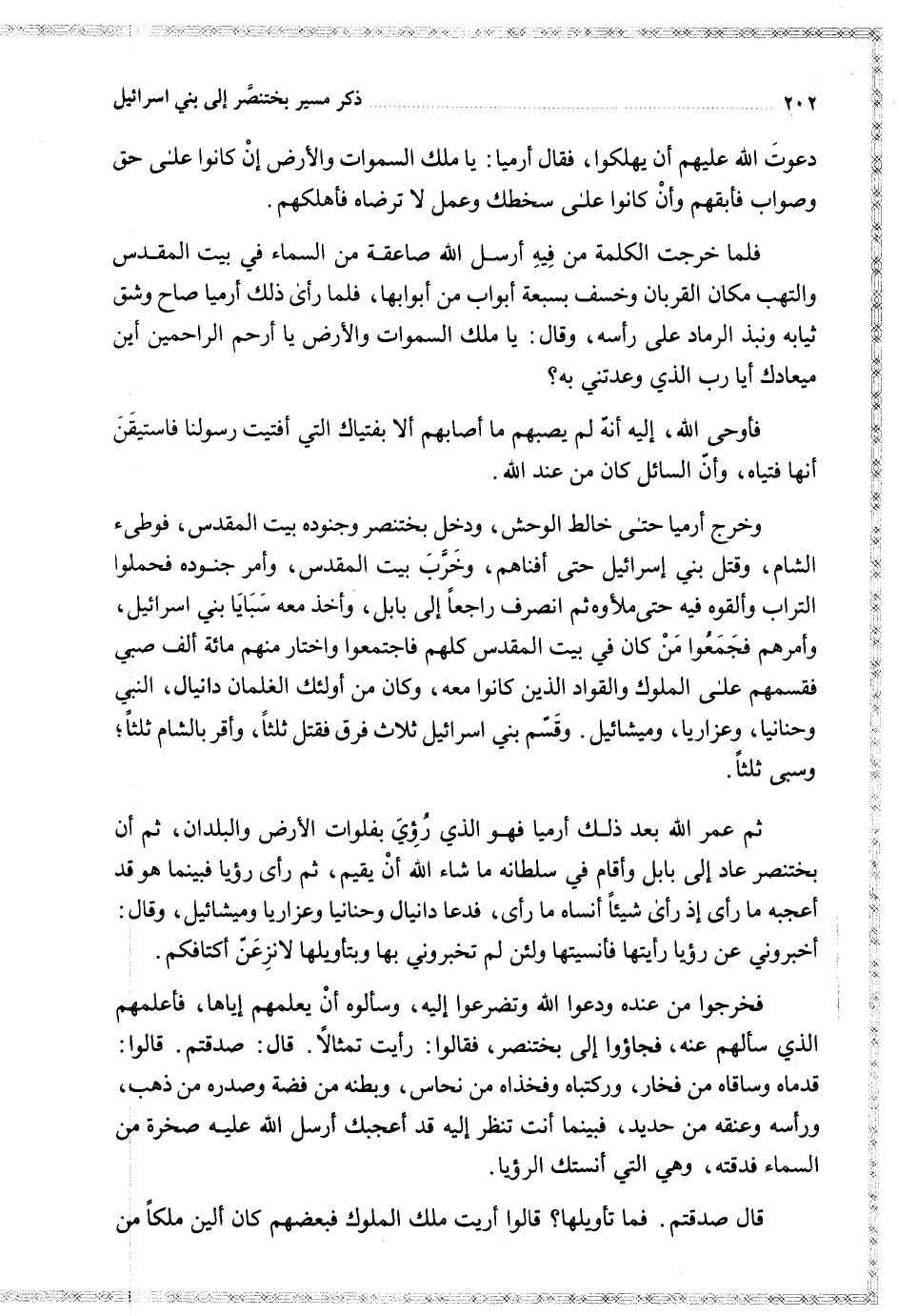 ثم عمر الله بعد ذلك أرميا فهو الذي رؤي بفلوات الأرض و البلدان ثم أن بختنصر عاد إلى بابل و أقام في سلطانه ما شاء الله أن يقيم ثم رأى رؤيا فبينما هو قد أعجبه ما رأى إذ رأى شيئا أنساه ما رأى فدعا دانيال وحنانيا وغزاريا وميشائيل وقال أخبروني عن رؤيا رأيتها فأنسيتها ولئن لم تخبروني بها وبتأويلها لانزعن أكتافكم