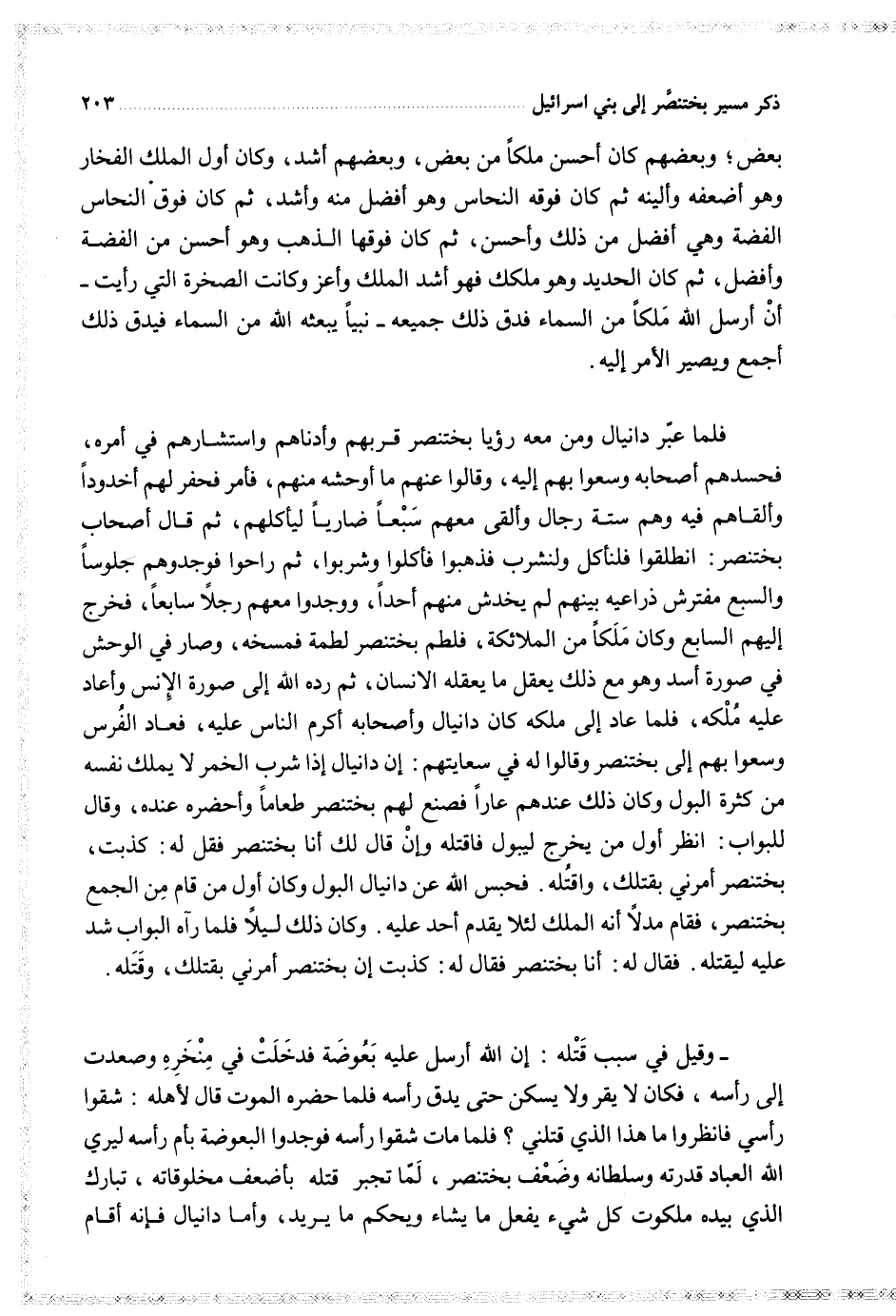 فلما عبر دانيال ومن معه رؤيا بختنصر قربهم و أدناهم و استشارهم في أمره فحسدهم أصحابه وسعوا بهم إليه وقالوا عنهم ما أوحشه منهم فأمر فحفر لهم أخدودا و ألقاهم فيه وهم ستة رجال و ألقى معهم سبعا ضاريا ليأكلهم ثم قال أصحاب بختنصر انطلقوا فلنأكل ولنشرب فذهبوا فأكلوا وشربوا ثم راحوا فوجدوهم جلوسا و السبع مفترش ذراعيه بينهم لم يخدش منهم أحدا لم يخدش منهم أحدا ووجدوا معهم رجلا فوجدوهم جلوسا و السبع مفترش ذراعيه بينهم لم يخدش منهم أحدا ووجدوا معهم رجلا سابعا فخرج إليهم السابع وكان ملكا من الملائكة فلطم بختنصر لطمة فمسخه وصار في الوحش في صورة أسد وهو مع ذلك يعقل ما يعقله الانسان ثم ردوه الله إلى صورة الإنس و أعاد عليه ملكه فلما عاد إلى ملكه كان دانيال و أصحابه أكرم الناس عليه فعاد الفرس وسعوا بهم إلى بختنصر وقالوا له في سعايتهم إن دانيال إذا شرب الخمر لا يملك نفسه من كثرة البول وكان ذلك عندهم عارا فصنع لهم بختنصر طعاما وأحضره عنده وقال للبواب انظر أول من يخرج ليبول فاقتله وأن قال لك أنا بختنصر فقل له كذبت بختنصر أمرني بقتلك و اقتله فحبس الله عن دانيال البول وكان أول من قام من الجمع بختنصر فقام مدلا أنه الملك لئلا يقدم أحد عليه وكان ذلك ليلا فلما رآه البواب شد عليه ليقتله فقال له أنا بختنصر فقال له كذبت إن بختنصر أمرني بقتلك وقتله وقيل في سبب قتله أن الله أرسل عليه بعوضة فدخلت في منخره وصعدت إلى رأسه فكان لايقر ولا يسكن حتى يدق رأسه فلما حضره الموت قال لأهله شقوا رأسي فانظروا ما هذا الذي قتلني فلما مات شقوا رأسه فوجدوا البعوضة بأم رأسه ليري الله العباد قدرته وسلطانه وضعف بختنصر لما تجبر قتله بأضعف مخلوقاته تبارك الذي بيده ملكوت كل شيء يفعل ما يشاء ويحكم ما يريد و أما دانيال فإنه أقام