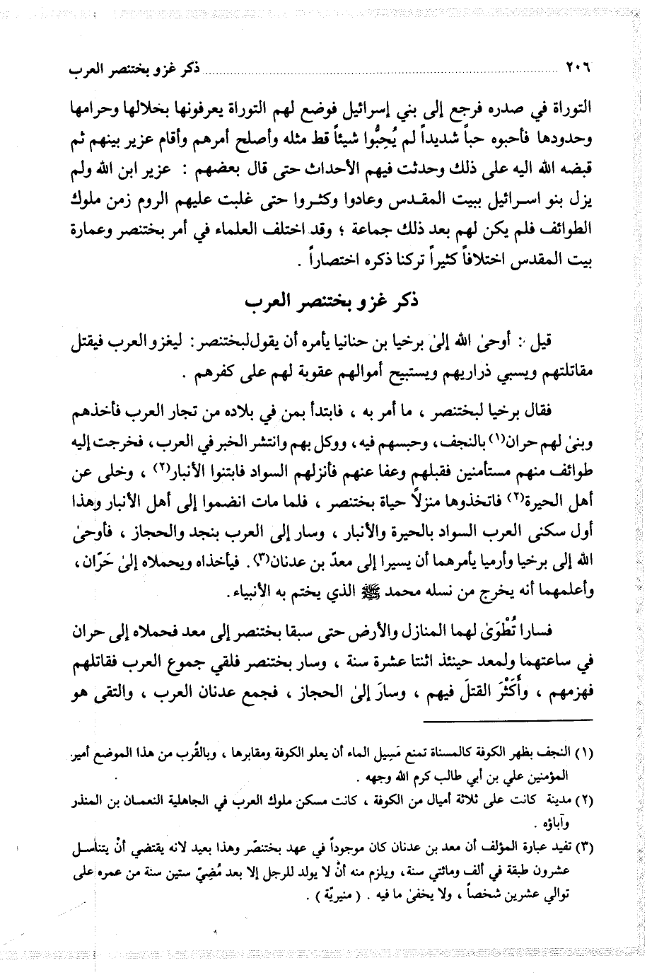 فقال برخيا لبختنصر ما أمر به فابتدأ بمن في بلاده من تجار العرب فأخذهم وبنى لهم حران بالنجف وحبسهم فيه ووكل بهم وانتشر الخبر في العرب فخرجت إليه طوائف منهم مستأمنين فقبلهم وعفا عنهم فأنزلهم السواد فابتنوا الأنبار وخلى عن أهل الحيرة فاتخذوها منزلا حياة بخنتصر فلما مات انضموا إلى أهل الأنبار وهذا أول سكنى العرب السواد بالحيرة والأنبار وسار إلى العرب بنجد والحجاز فأوحى الله إلى برخيا وأرميا يأمرهما أن يسيرا إلى معد بن عدنان فيأخذاه ويحملاه إلى حران وأعلمهما أنه يخرج من نسله محمد الذي يختم به الأنبياء