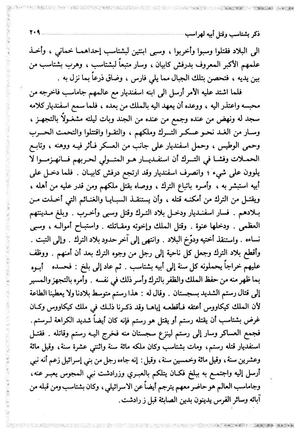 فلما اشتد عليه الأمر أرسل إلى ابنه اسفنديار مع عامهم جاماساب فاخرجه من محبسه واعتذر إليه ووعد أن يعهد إليه بالملك من بعده فلما سمع اسفنديار كلامه سجد له ونهض من عنده وجمع من عنده من الجند وبات ليلته مشغولا بالتجهيز وسار من الغد نحو عسكر الترك وملكهم والتقوا واقتتلوا والتحمت الحرب وحمى الوطيس وحمل اسفندار على جانب من العسكر فأثر فيه ووهنه وتابع الحملات وفشا في الترك أن اسفنديار هو المتولي لحربهم فانهزموا لا يلوون على شيء وانصرف اسفنديار وقد ارتجع درفش كابيان فلما دخل على أبيه اسبشر به وأمره باتباع الترك ووصاه بقتل ملكهم ومن قدر عليه من أهله ويقتل من الترك من أمكنه قتله وأن يستنقذ السبايا والغنائم التي أخذت من بلادهم فسار اسفنديار ودخل بلاد الترك وقتل وسبى وأخرب وبلغ مدينتهم العظمى ودخلها عنوة وقتل الملك وإخوته ومقاتلته واستباح أمواله وسبى نساءه واستنقذ أختيه ودوخ البلاد وانتهى إلى آخر حدود بلاد الترك وإلى التبت وأقطع بلاد الترك وجعل كل ناحية إلى رجل من وجوه الترك بعد أن أمنهم ووظف عليهم خراجا يحملونه كل سنة إلى أبيه بشتاسب ثم عاد إلى بلخ فحسده أبوه بما ظهر منه من حفظ الملك والظفر بالترك وأسر ذلك في نفسه وأمره بالتجهيز والمسير إلى قتال رستم الشديد بسجستان وقال له هذا رستم متوسط بلادنا ولا يعطينا الطاعة لأن الملك كيكاووس أعتقه فأقطعه إياها وقد ذكرنا ذلك في ملك كيكاووس وكان غرض بشتاسب أن يقتله رستم أو يقتل هو رستم فإنه كان أيضا شديد الكراهية لرستم فجمع العساكر وسار إلى رستم لينزع سجستان منه فخرج إليه رستم وقاتله فقتل اسفنديار قتله رستم ومات بشتاسب وكان ملكه مائة سنة واثنتي عشرة سنة وقيل مائة وعشرين سنة وقيل مائة وخمسين سنة وقيل إنه جاءه رجل من بني إسرائيل زعم أنه نبي أرسل إليه واجتمع به ببلخ فكان يتلكم بالعبري وزرادشت نبي المجوس يعبر عنه وجاماسب العالم هو حاضر معهم يترجم أيضا عن الإسرائيلي وكان بشتاسب ومن قبله من آبائه وسائر الفرس يدينون بدين الصائبة قبل زرادشت