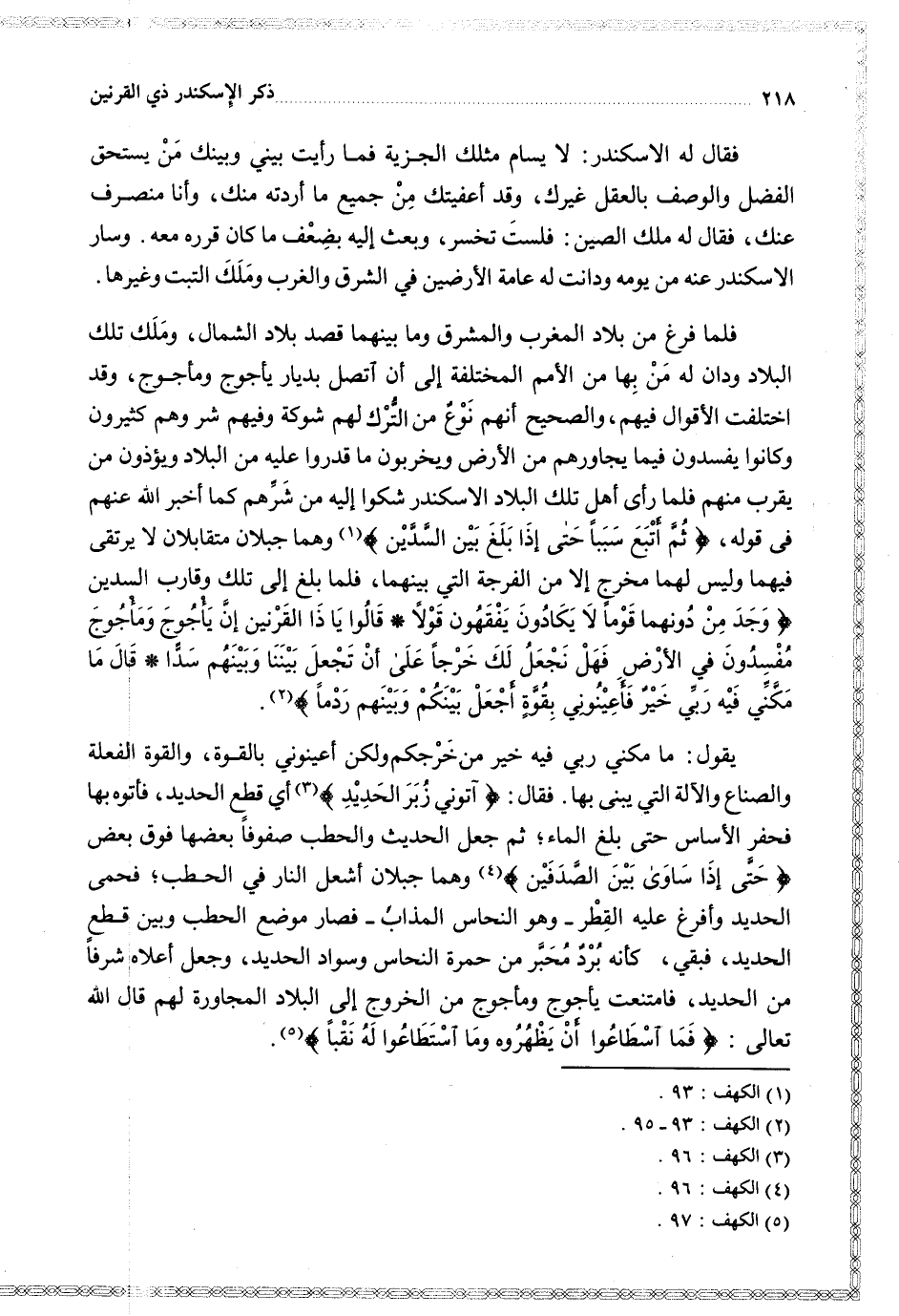 فلما فرغ من بلاد المغرب والمشرق وما بينهما قصد بلاد الشمال وملك تلك البلاد ودان له من بها من الأمم المختلفة إلى أن اتصل بديار يأجوج ومأجوج وقد اختلفت الأقوال فيهم والصحيح أنهم نوع من الترك لتهم شوكة وفيهم شر وهم كثيرون وكانوا يفسدون فيما يجاورهم من الأرض ويخربون ما قدروا عليه من البلاد ويؤذون من يقرب منهم فلما رأى أهل تلك البلاد الإسكندر شكوا إليه من شرهم كما أخبر الله عنهم في قوله { ثم أتبع سببا حتى إذا بلغ بين السدين } وهما جبلان متقابلان لا يرتقى فيهما وليس لهما مخرج إلا من الفرجة التي بينهما فلما بلغ إلى تلك وقارب السدين { وجد من دونهما قوما لا يكادون يفقهون قولا قالوا يا ذا القرنين إن يأجوج ومأجوج مفسدون في الأرض فهل نجعل لك خرجا على أن تجعل بيننا وبينهم سدا قال ما مكني فيه ربي خير فأعينوني بقوة أجعل بينكم وبينهم ردما }