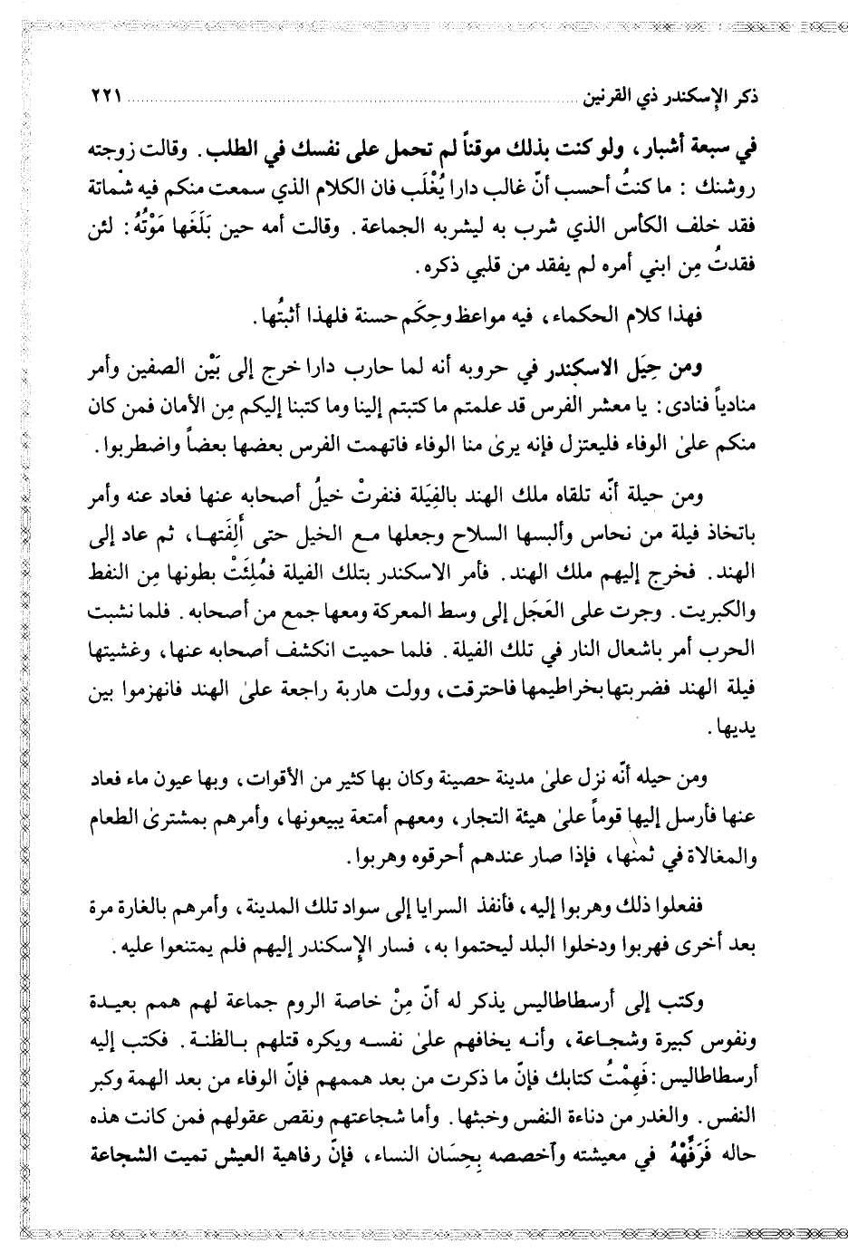 ومن حيله أنه تلقاه ملك الهند بالفيلة فنفرت خيل أصحابه عنها فعاد عنه وأمر باتخاذ فيلة من نحاس وألبسها السلاح وجعلها مع الخيل حتى ألفتها ثم عاد إلى الهند فخرج إليهم ملك الهند فأمر الإسكندر بتلك الفيلة فملئت بطونها من النفط والكبريت وجرت على العجل إلى وسط المعركة ومعها جمع من أصحابه فلما نشبت الحرب أمر باشعال النار في تلك الفيلة فلما حميت انكشف أصحابه عنها وغشيتها فيلة الهند فضربتها بخراطيمها فاحترقت وولت هاربة راجعة على الهند فانهزموا بين يديها