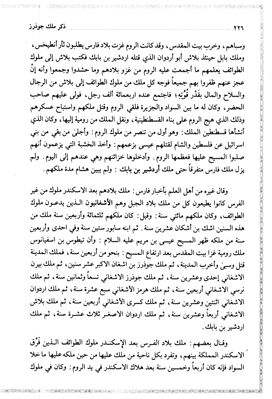 وسباهم وخرب بيت المقدس وقد كانت الروم غزت بلاد فارس يطلبون ثأر أنطيخس وملك بابل حينئذ بلاش أبو أردوان الذي قتله اردشير بن بابك فكتب بلاش إلى ملوك الطوائف يعلمهم ما أجمعت عليه الروم من غزو بلادهم وما حشدوا وجمعوا وأنه إن عجز عنهم ظفروا بهم جميعا فوجه كل ملك من الطوائف إلى بلاش من الرجال والسلاح والمال بقدر قوته فاجتمع عنده اربعمائة ألف رجل فولى عليهم صاحب الحضر وكان له ما بين السواد والجزيرة فلقي الروم وقتل ملكهم واستباح عسكرهم وذلك الذي هيج الروم على بناء القسطنطينية ونقل الملك من رومية إليها وكان الذي أنشأها قسطنطين الملك وهو أول من تنصر من ملوك الروم وأجلى من بقي من بني إسرائيل عن فلسطين والشام لقتلهم عيسى بزعمهم وأخذ الخشبة التي يزعمون أنهم صلبوا عليها المسيح فعظمها الروم وأدخلوها خزائنهم وهي عندهم إلى اليوم ولم يزل ملك فارس متفرقا حتى ملك أردشير بن بابك ولم يبين هشام مدة ملكهم