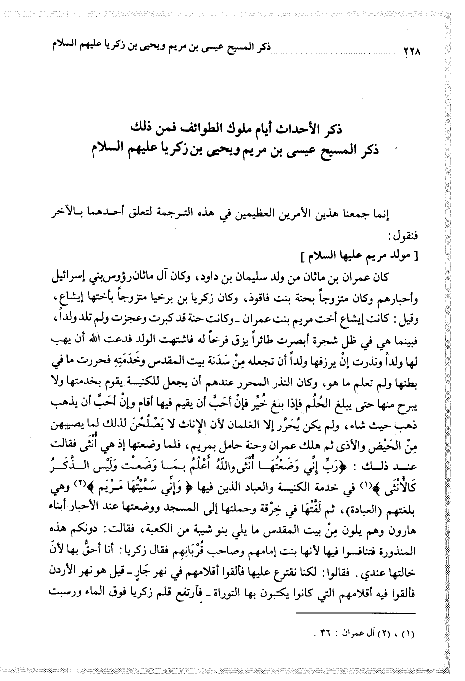 كان عمران بن ماثان من ولد سليمان بن داود وكان آل ماثان رؤوس بني إسرائيل وأحبارهم وكان متزوجا بحنة بنت فاقوذ وكان زكريا بن برخيا متزوجا بأختها إيشاع وقيل كانت إيشاع أخت مريم بنت عمران وكانت حنة قد كبرت وعجزت ولم تلد ولدا فبينما هي في ظل شجرة أبصرت طائرا يزق فرخا له فاشتهت الولد فدعت الله أن يهب لها ولدا ونذرت إن يرزقها ولدا أن تجعله من سدنة بيت المقدس وخدمته فحررت ما في بطنها ولم تعلم ما هو وكان النذر المحرر عندهم أن يجعل للكنيسة يقوم بخدمتها ولا يبرح منها حتى يبلغ الحلم فإذا بلغ خير فإن أحب أن يقيم فيها أقام وإن أحب أن يذهب ذهب حيث شاء ولم يكن يحرر إلا للغلمان لأن الإناث لا يصلحن لذلك لما يصيبهن من الحيض والأذى ثم هلك عمران وحنة حامل بمريم فلما وضعت إذ هي أنثى فقالت عند ذلك {رب إني وضعتها أنثى والله أعلم بما وضعت وليس الذكر كالأنثى} في خدمة الكنيسة والعباد الذين فيها {وإني سميتها مريم} وهي بلغتهم العبادة ثم لفتها في خرقة وحملتها إلى المسجد ووضعتها عند الأحبار أبناء هارون وهم يلون من بيت المقدس ما يلي بنو شيبة من الكعبة فقالت دونكم هذه المنذورة فتنافسوا فيها لأنها بنت إمامهم وصاحب قربانهم فقال زكريا أنا أحق بها لأن خالتها عندي فقالوا لكنا نقترع عليها فألقوا أقلامهم في نهر جار قيل هو نهر الأردن فألقوا فيه أقلامهم التي كانوا يكتبون بها التوراة فارتفع قلم زكريا فوق الماء ورسبت