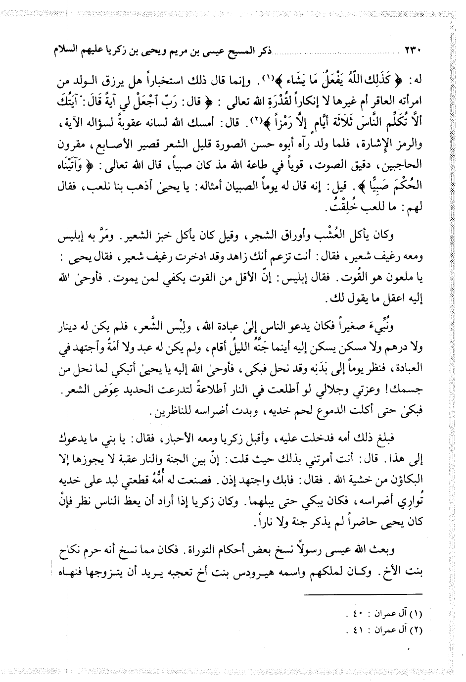 فبلغ ذلك أمه فدخلت عليه وأقبل زكريا ومعه الأحبار فقال يا بني ما يدعوك إلى هذا قال أنت أمرتني بذلك حيث قلت إن بين الجنة والنار عقبة لا يجوزها إلا البكاؤن من خشية الله فقال فابك واجتهد إذن فصنعت له أمه قطعتي لبد على خديه تواري أضراسه فكان يبكي حتى يبلهما وكان زكريا إذا أراد أن يعظ الناس نظر فإن كان يحيى حاضرالم يذكر جنة ولا نارا