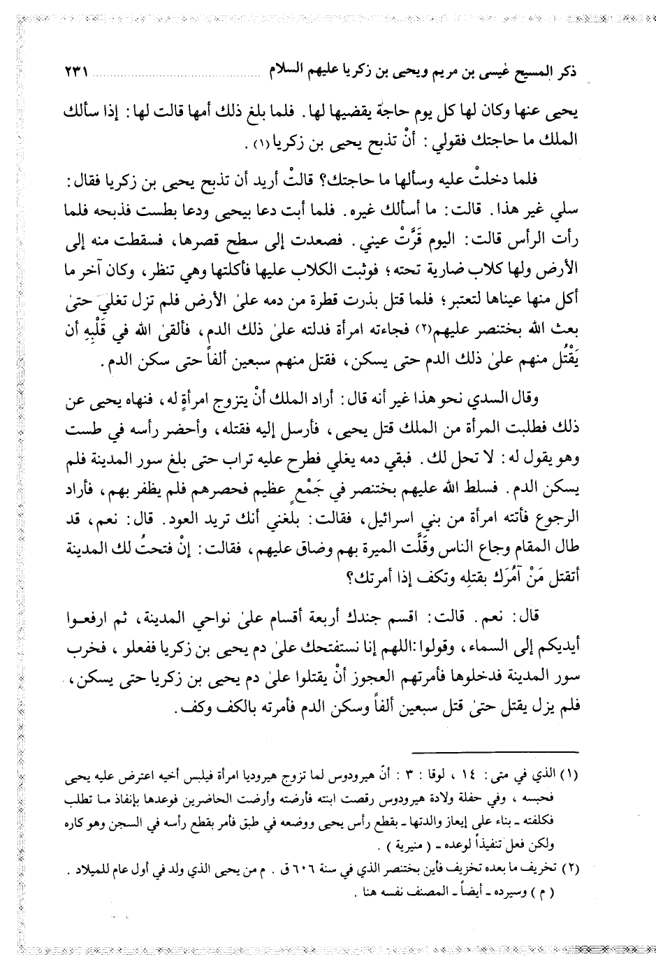 قال نعم قالت اقسم جندك أربعة أقسام على نواحي المدينة ثم ارفعوا أيديكم إلى السماء وقولوا اللهم إنا نستفتحك على دم يحيى بن زكريا ففعلوا فخرب سور المدينة فدخلوها فأمرتهم العجوز أن يقتلوا على دم يحيى ين زكريا حتى يسكن فلم يزل يقتل حتى قتل سبعين ألف وسكن الدم فأمرته بالكف وكف