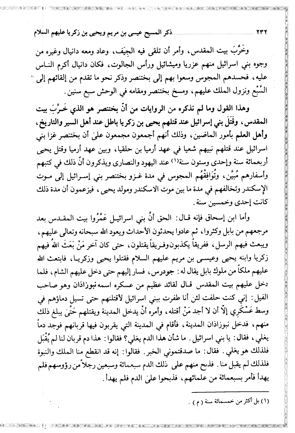 وهذا القول وما لم نذكره من الروايات من أن بختنصر هو الذي خرب بيت المقدس وقتل بني إسرائيل عند قتلهم يحيى بن زكريا باطل عند أهل السير والتاريخ وأهل العلم بأمور الماضين وذلك أنهم أجمعون مجمعون على أن بختنصر غزا بني إسرائيل عند قتلهم نبيهم شعيا في عهد أرميا بن حلقيا وبين عهد أرميا وقتل يحيى أربعمائة سنة وإحدى وستون سنة عند اليهود والنصارى ويذكرون أن ذلك في كتبهم وأسفارهم مبين وتوافقهم المجوس في مدة غزو بختنصر بني إسرائيل إلى موت الإسكندر وتخالفهم في مدة ما بين موت الإسكندر ومولد يحيى فيزعمون أن مدة ذلك كانت إحدى وخمسين سنة