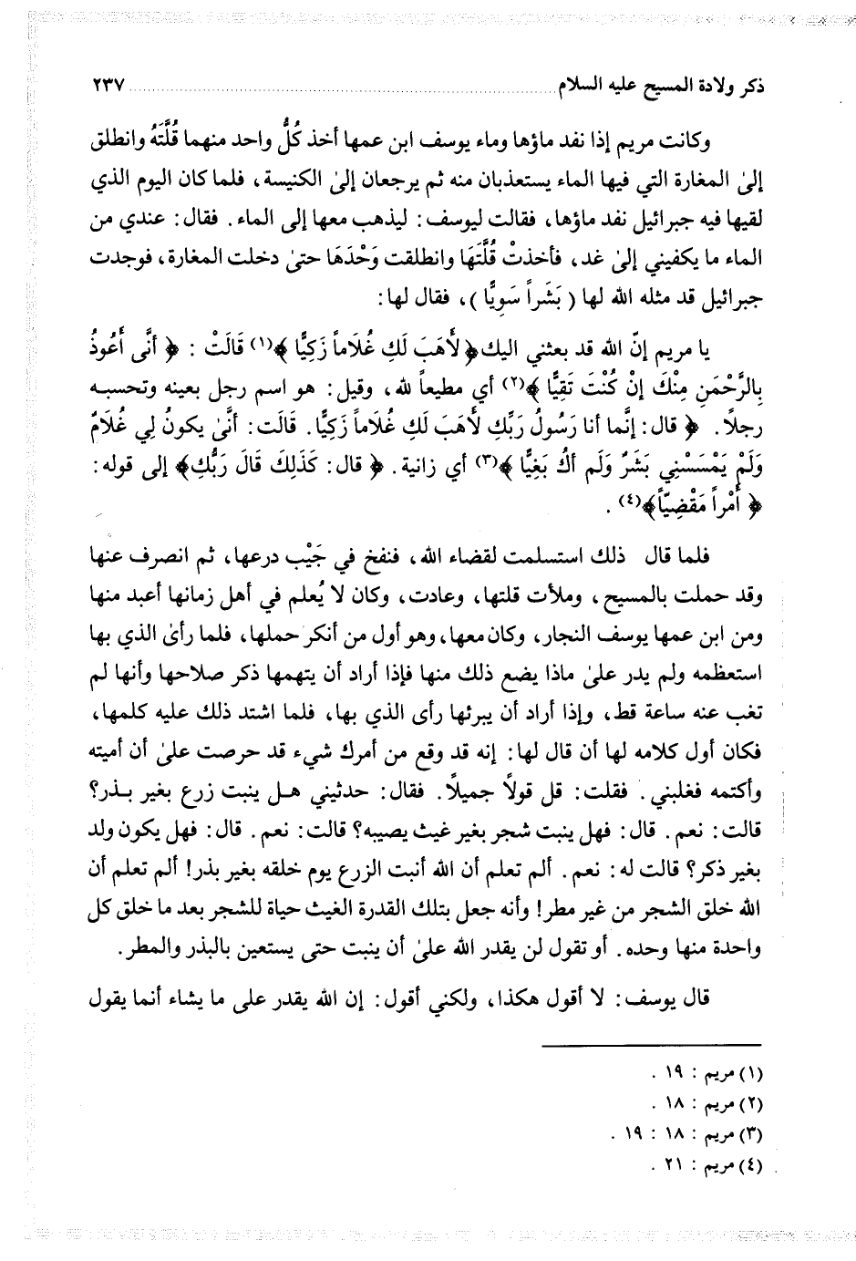 فلما قال ذلك استسلمت لقضاء الله فنفخ في جيب درعها ثم انصرف عنها وقد حملت بالمسيح وملأت قلتها وعادت وكان لا يعلم في أهل زمانها أعبد منها ومن ابن عمها يوسف النجار وكان معها وهو أول من أنكر حملها فلما رأت الذي بها استعظمته ولم يدر على ماذا يضع ذلك منها فإذا أراد أن يتهمها ذكر صلاحها وأنها لم تغب عنه ساعة قط وإذا أراد أن يبرئها رأى الذي بها فلما اشتد ذلك عليه كلمها فكان أول كلامه لها أن قال لها إنه قد وقع من أمرك شيء قد حرصت على أن أميته وأكتمه فغلبني فقلت قل قولا جميلا فقال حدثيني هل ينبت زرع بغير بذر قالت نعم قال فهل ينبت شجر بغير غيث يصيبه قالت نعم قال فهل يكون ولد بغير ذكر قالت له نعم ألم تعلم أن الله أنبت الزرع يوم خلقه بغير بذر ألم تعلم أن الله خلق الشجر من غير مطر وأنه جعل بتلك الغيث حياة للشجر بعد ما خلق كل واحدة منها وحده أو تقول لن يقدر الله على أن ينبت حتى يستعين بالبذر والمطر