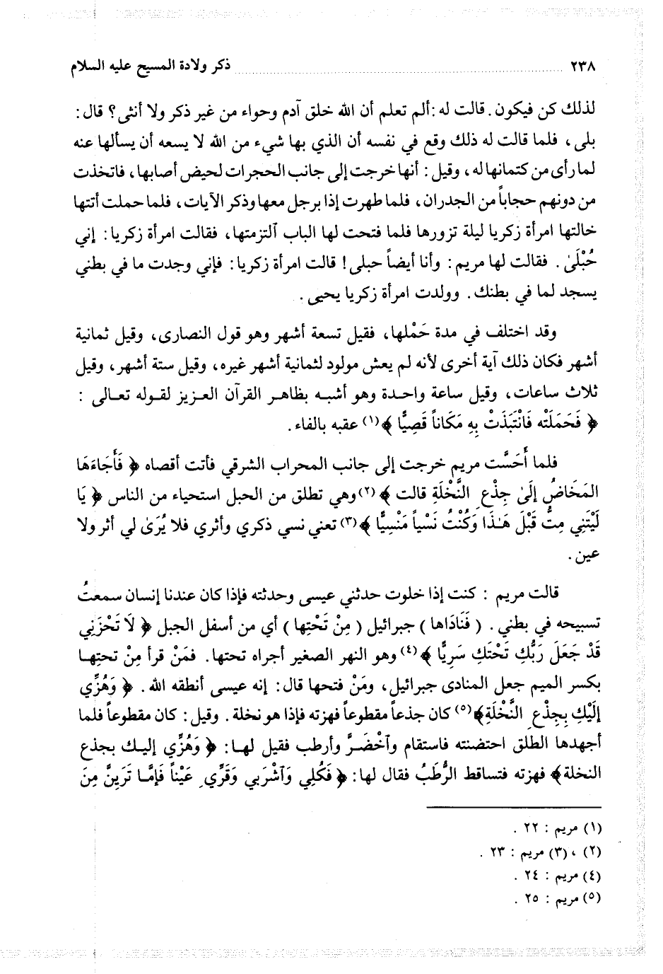 لذلك كن فيكون قالت له ألم تعلم أن الله خلق آدم وحواء من غير ذكر ولا أنثى قال بلى فلما قالت له ذلك وقع في نفسه أن الذي بها شيء من الله لا يسعه أن يسألها عنه لما رأى من كتمانها له وقيل أنها خرجت إلى جانب الحجرات لحيض أصابها فاتخذت من دونهم حجابا من الجدران فلما طهرت إذا برجل معها وذكر الآيات فلما حملت أتتها خالتها امرأة زكريا ليلة تزورها فلما فتحت لها الباب التزمتها فقالت امرأة زكريا إني حبلى فقالت لها مريم وأنا أيضا حبلى قالت امرأة زكريا فإني وجدت ما في بطني يسجد لما في بطنك وولدت امرأة زكريا يحيى