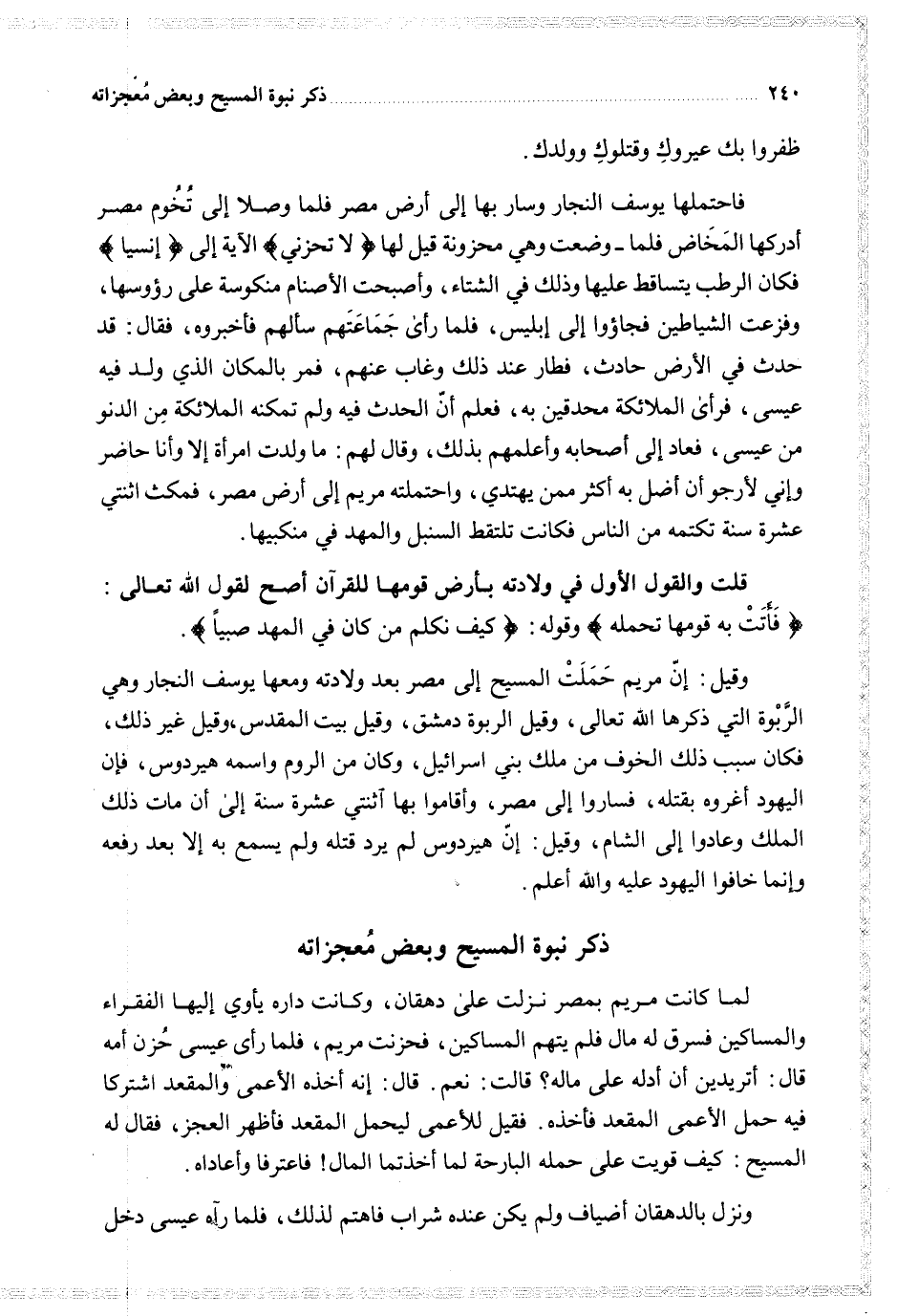 وقيل إن مريم حملت المسيح إلى مصر بعد ولادته ومعها يوسف النجار وهي الربوة التي ذكرها الله تعالى وقيل الربوة دمشق وقيل بيت المقدس وقيل غير ذلك فكان سبب ذلك الخوف من ملك بني إسرائيل وكان من الروم واسمه هيردوس فإن اليهود أغروه بقتله فساروا إلى مصر وأقاموا بها اثنتي عشرة سنة إلى أن مات ذلك الملك وعادوا إلى الشام وقيل إن هيردوس لم يرد قتله ولم يسمع به إلا بعد رفعه وإنما خافوا اليهود عليه والله أعلم