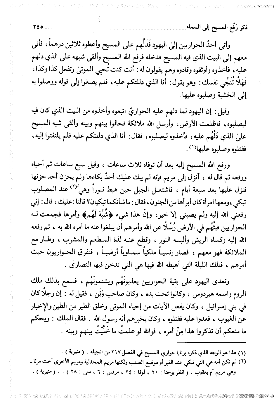 ورفع الله المسيح إليه بعد أن توفاه ثلاث ساعات وقيل سبع ساعات ثم أحياه ورفعه ثم قال له انزل إلى مريم فإنه لم يبك عليك أحد بكاءها ولم يحزن أحد حزنها فنزل عليها بعد سبعة أيام فاشتعل الجبل حين هبط نورا وهي عند المصلوب تبكي ومعها امرأة كان أبرأها من الجنون فقال ما شأنكما تبكيان قالتا عليك قال إني رفعني الله إليه ولم يصبني إلا خير وإن هذا شيء { شبه لهم } وأمرها فجمعت له الحواريين فبثهم الله في الأرض رسلا عن الله وأمرهم أن يبلغوا عنه ما أمره الله به ثم رفعه الله إليه وكساه الريش وألبسه النور وقطع عنه لذة المطعم والمشرب وطار مع الملائكة فهو معهم فصار إنسيا ملكيا سماويا أرضيا فتفرق الحواريون حيث أمرهم فتلك الليلة التي أهبط الله فيها هي التي تدخن فيها النصارى